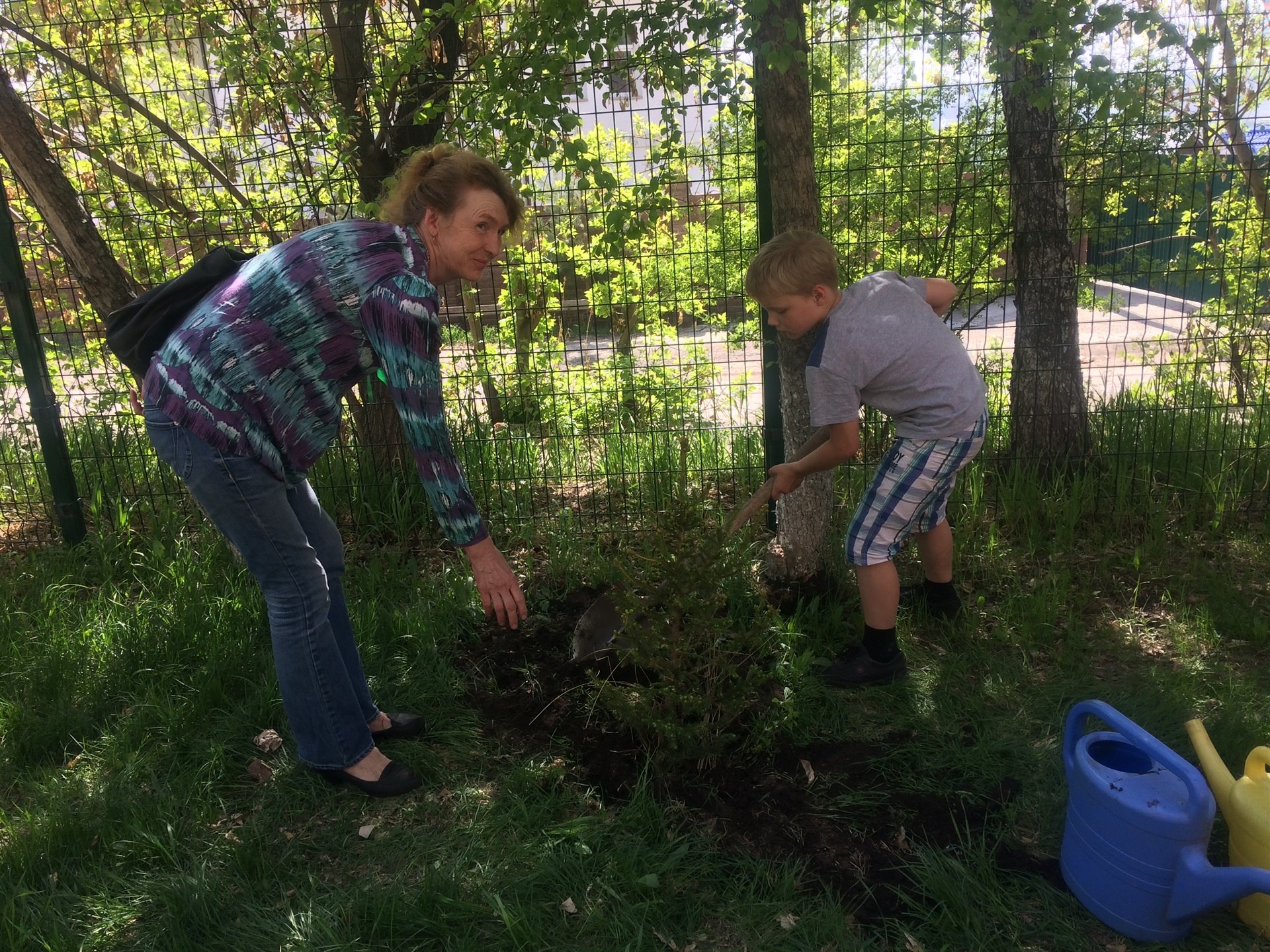 «Жизнь растет с тобой! » – «и наши деревца будут расти с нами, а мы за ними будем ухаживать» говорит Гильман Сема из детского сада №169 посадивший своё дерево с директором гимназии №2 Рублекским Дмитрием Васильевичам и выпускником гимназии Ожерельевым Гарри.