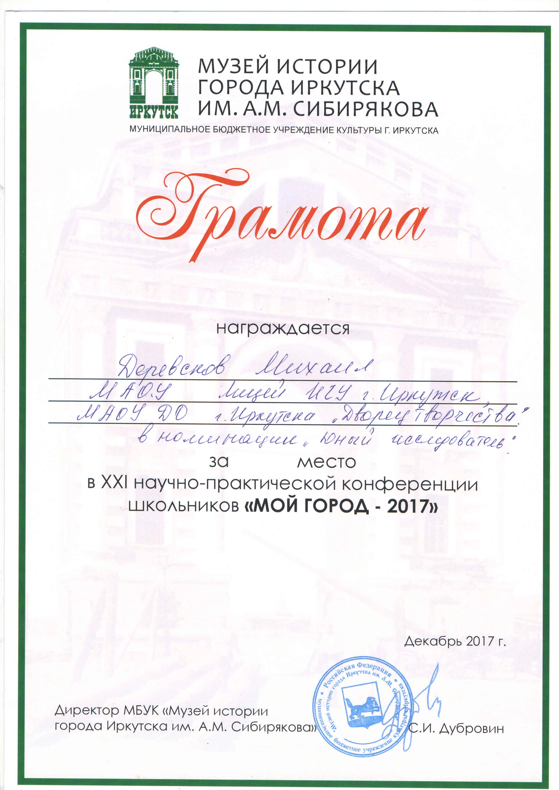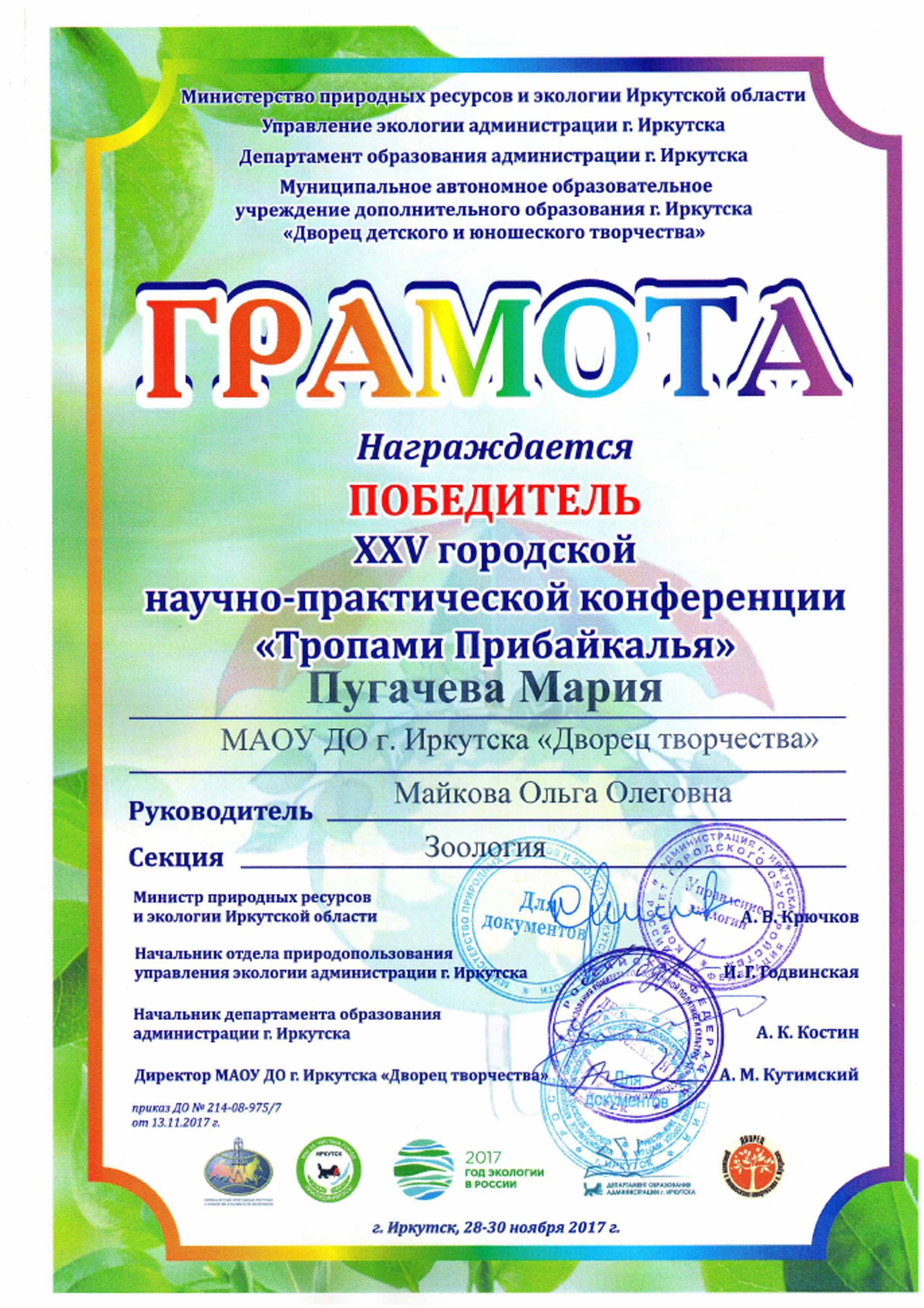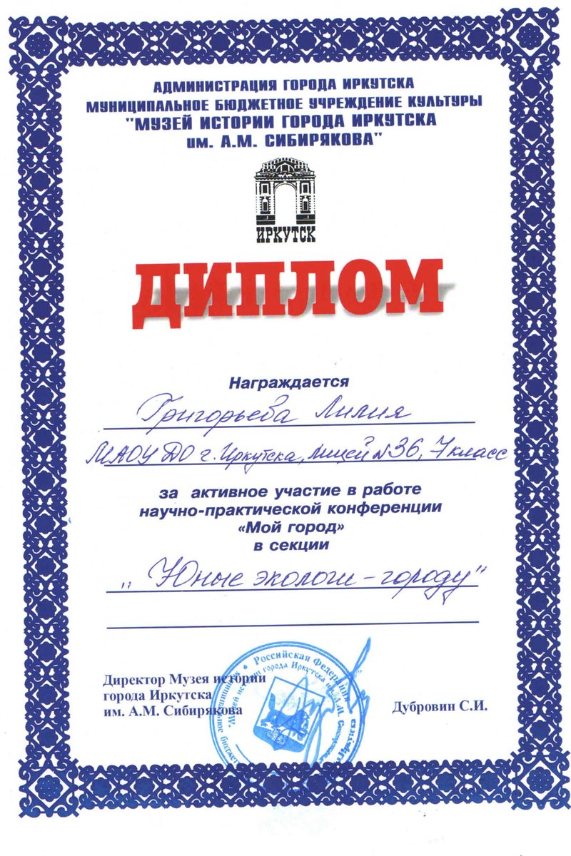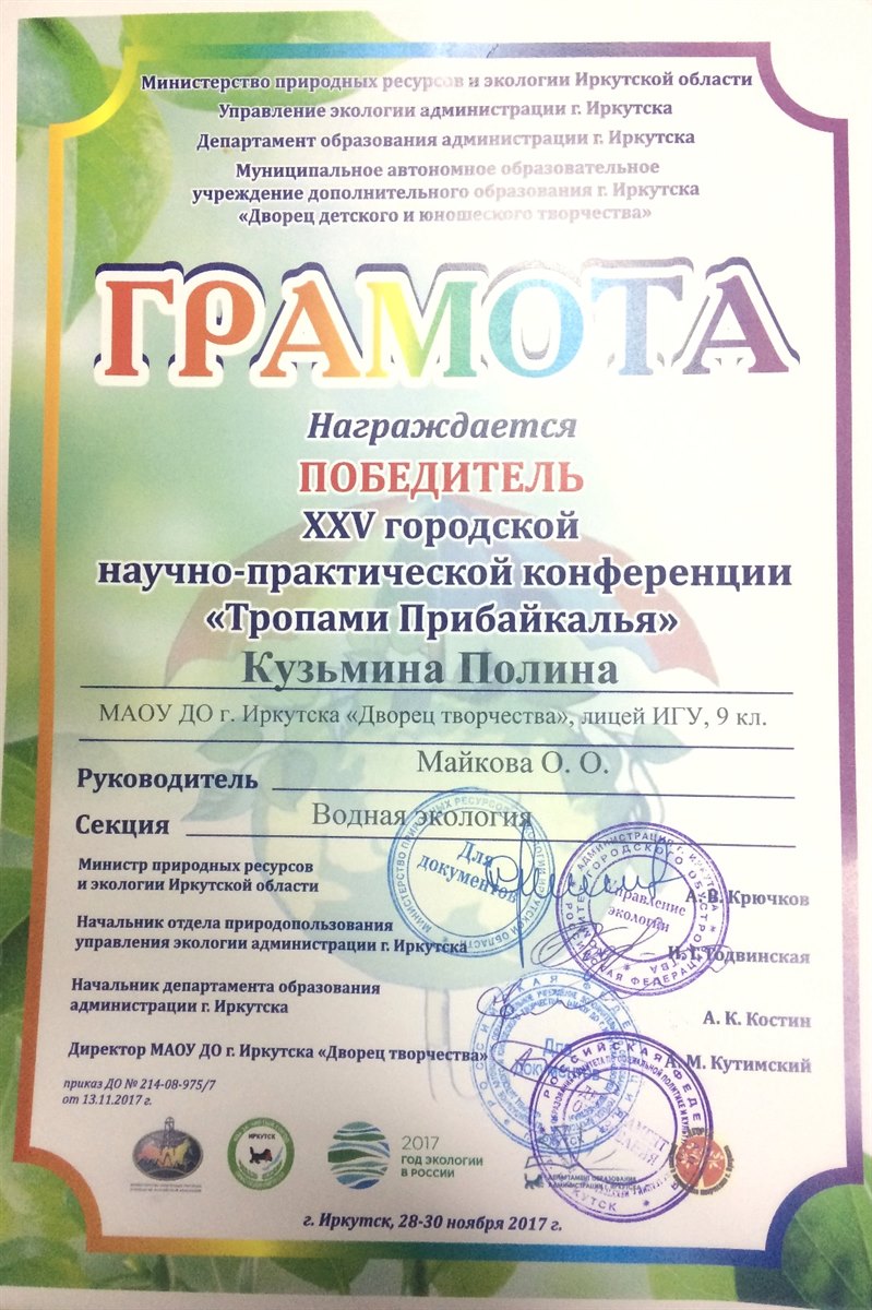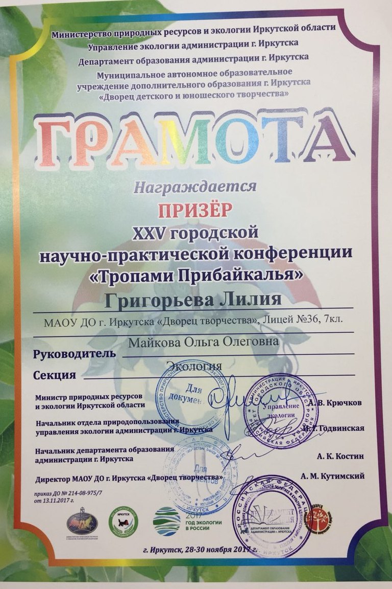 Целая команда «байкаловедов» приняла участие в XХI научно-практической конференции школьников «Мой город», где Пугачева Мария одержала победу на секции «Юные экологи – городу», а Деревсков Михаил был отмечен в номинации «Юный исследователь».