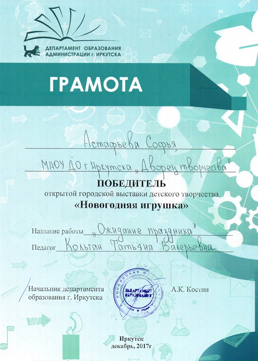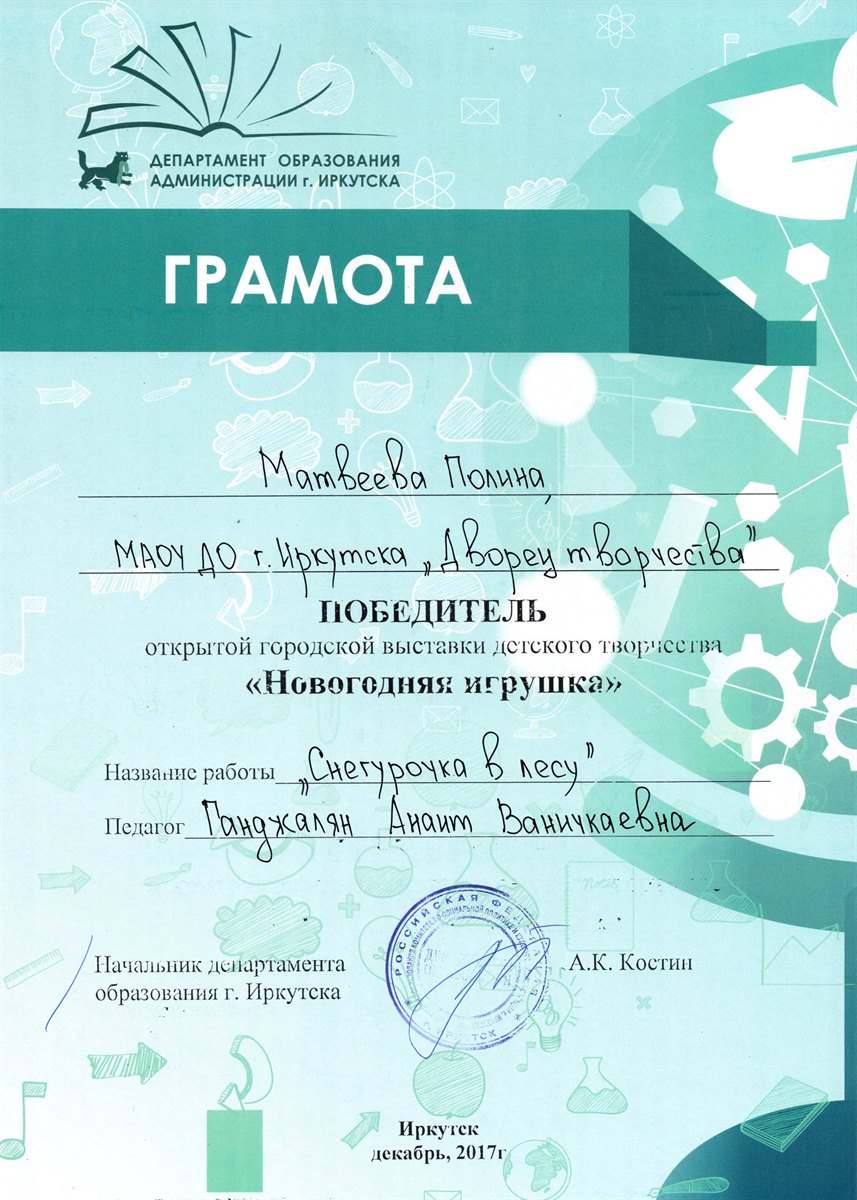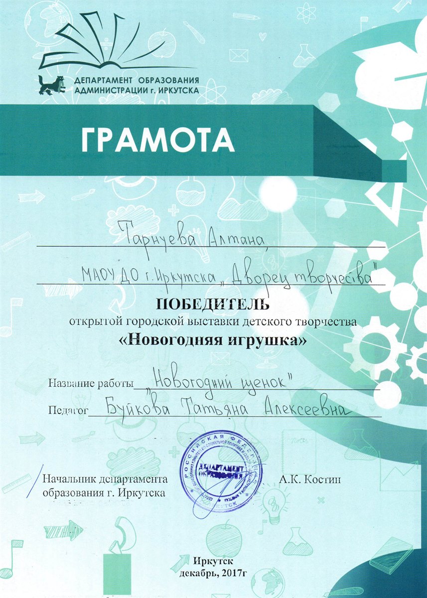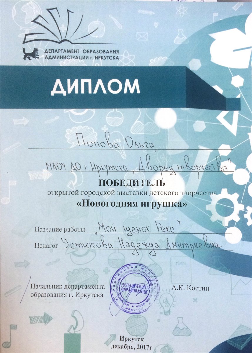 Поздравляем победителей открытой городской выставки детского творчества "Новогодняя игрушка", которая проходила в нашем городе с 4 по 15 декабря 2017 года. В выставке приняло участие 15 работ обучающихся Дворца творчества, из которых 7 работ стали победителями!