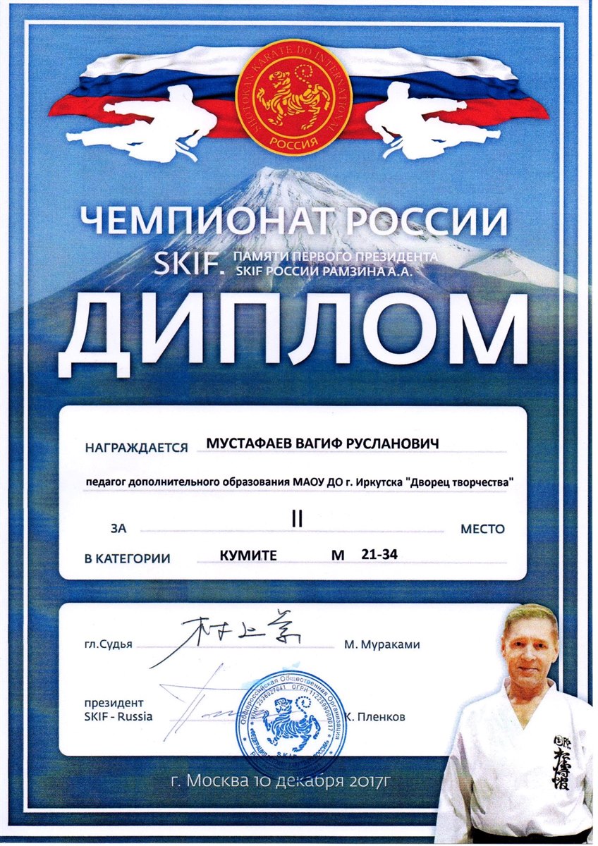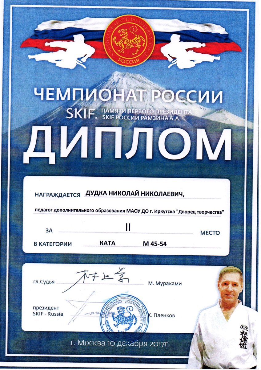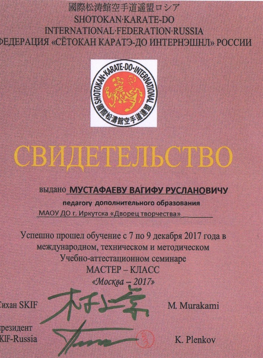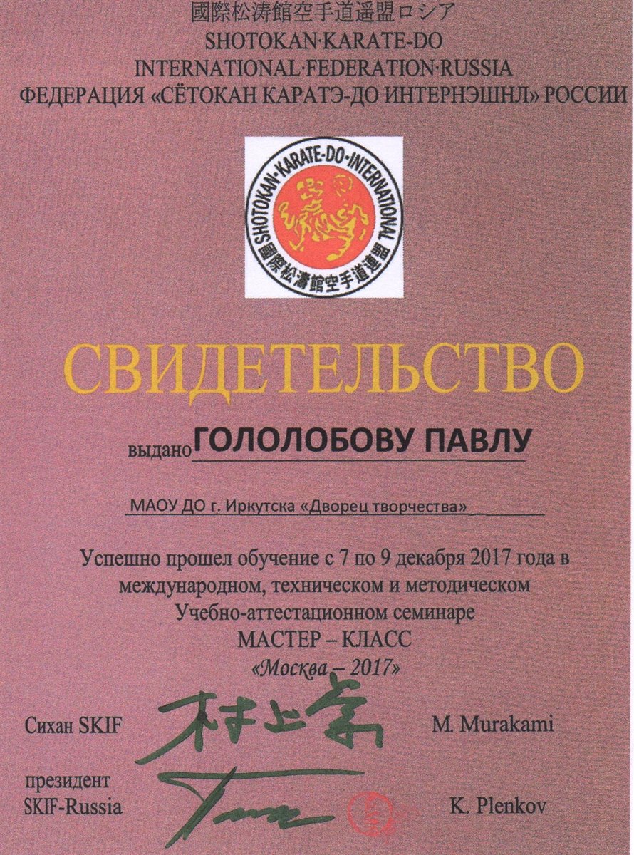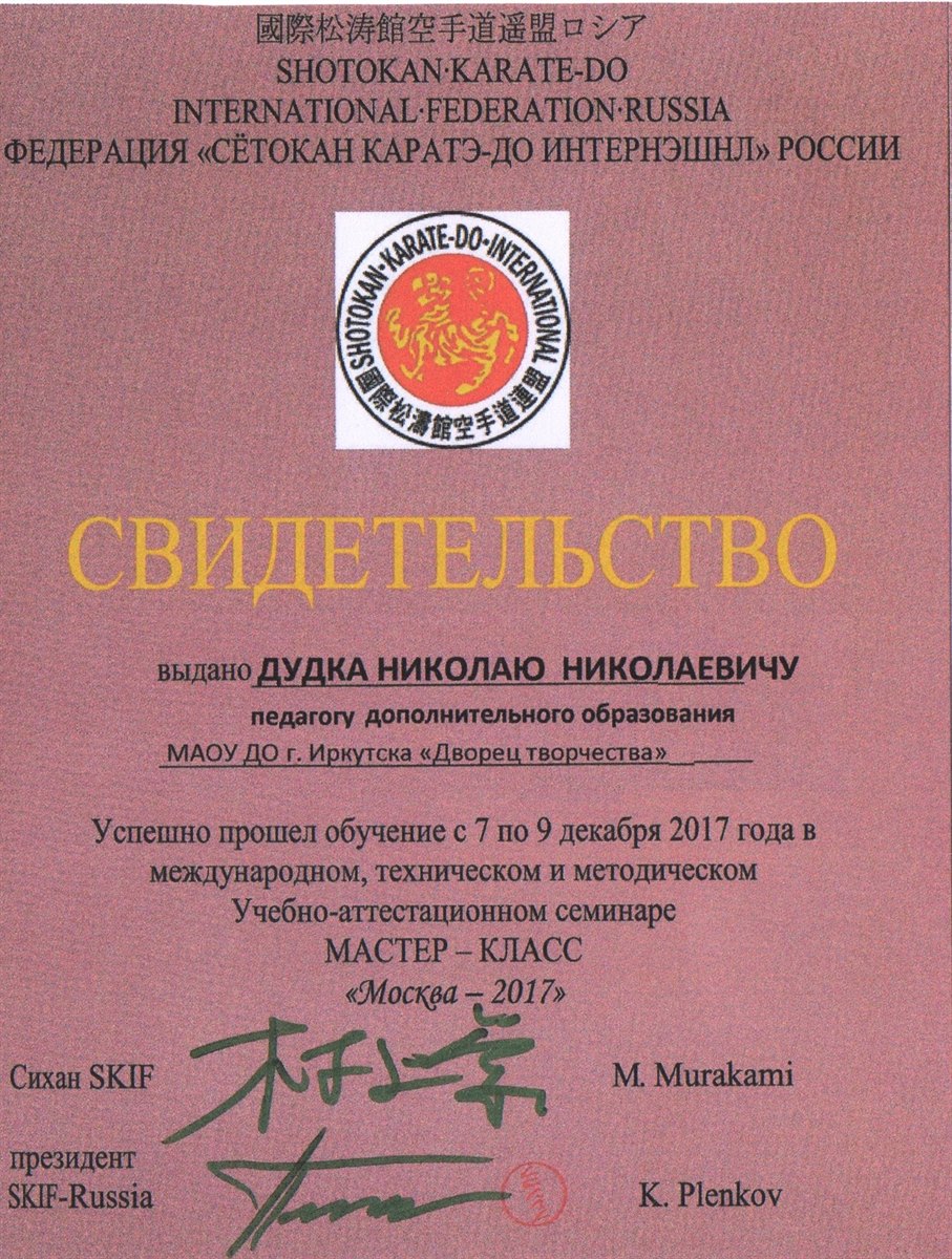 Команда секции "Сётокан каратэ-до" в составе 3-х человек: тренеров-преподавателей: Дудка Н.Н., Мустафаева В.Р. и обучающегося Гололобова Павла с 7-9 декабря 2017 года прошли курс обучения на международном семинаре S.K.I.F. под руководством многократного чемпиона мира и Японии по сётокан каратэ Манабу Мураками 8 Дан. По окончании учебно-тренировочного семинара, педагог младшей группы секции "Сётокан каратэ-до" Дворца творчества Мустафаев Вагиф Русланович успешно аттестовался на 3-ю ступень чёрного пояса по каратэ (3 Дан). А на следующий день на чемпионате России по сётокан каратэ Николай Николаевич Дудка – руководитель секции каратэ Дворца и Вагиф Русланович Мустафаев стали серебряными призёрами в своих возрастных категориях.