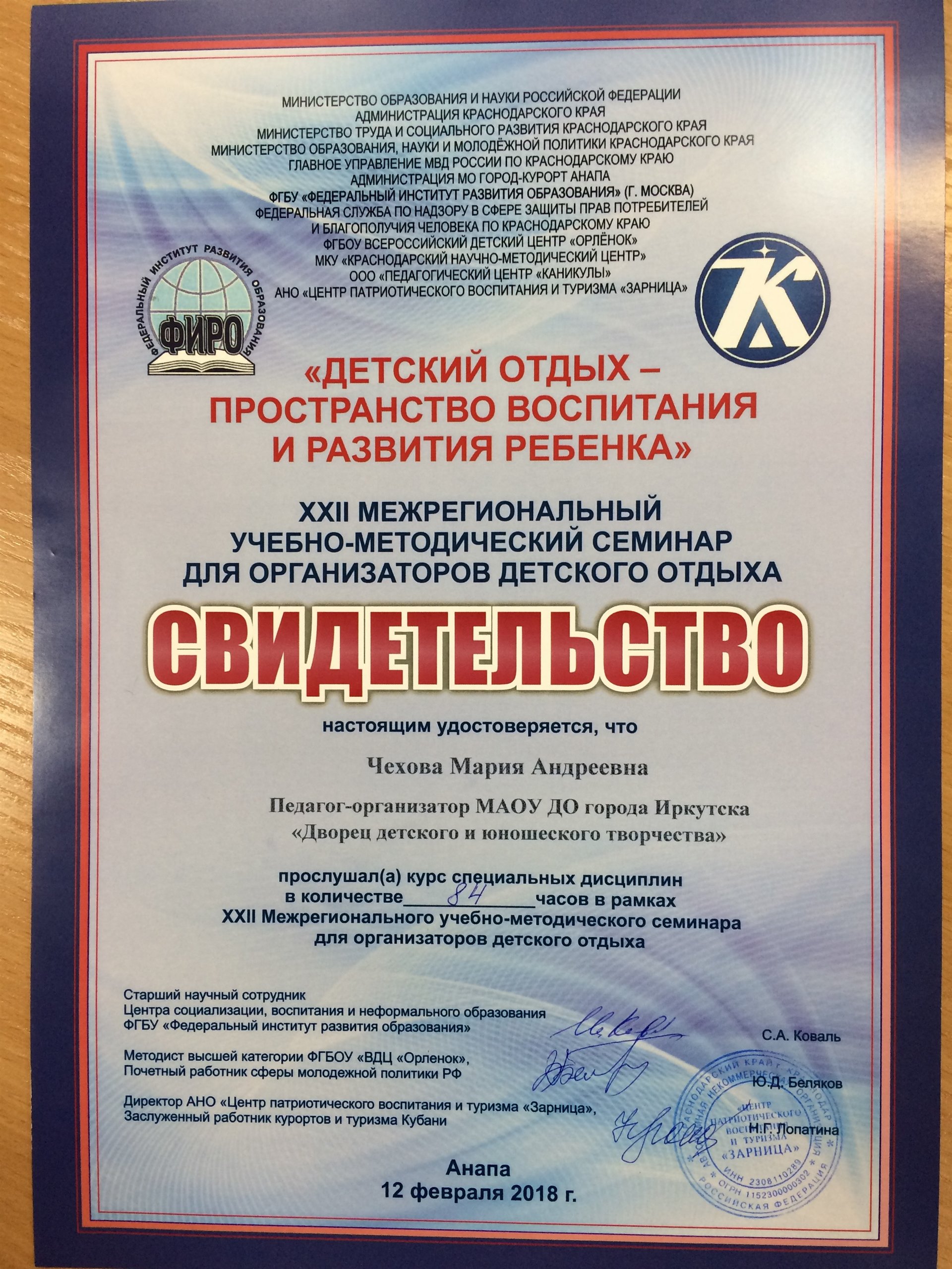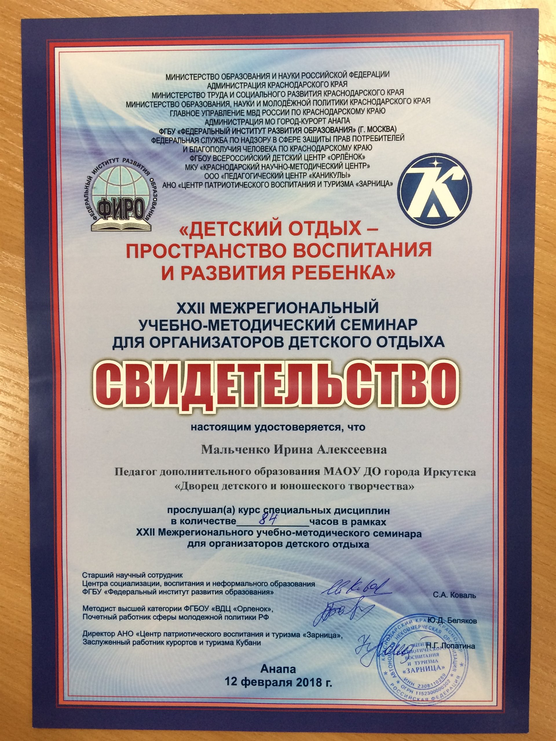 С 07 по 12 февраля 2018 года педагоги Дворца посетили XXII Межрегиональный учебно-методический семинар для организаторов детского отдыха «Детский отдых – пространство воспитания и развития ребенка». Главная задача учебно-методического семинара – оказать содействие организации содержательного, оздоровительного, развивающего отдыха с целью патриотического воспитания, гражданского становления детей и подростков России.
