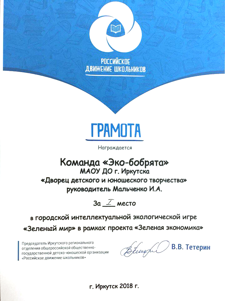 Мы поздравляем победителей – команду «Эко-бобрята», обучающихся Дворца творчества в составе: Деменская Вероника, Иванов Иван, Кутимская Екатерина, Кузнецов Иван, Толстиков Дмитрий. Педагог – Мальченко Ирина Алексеевна.