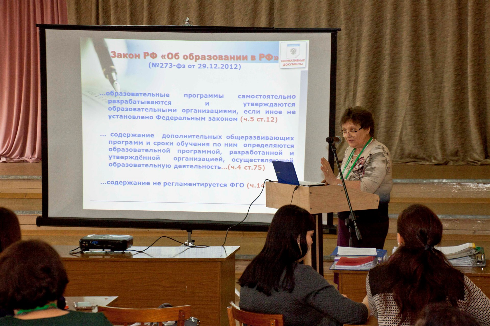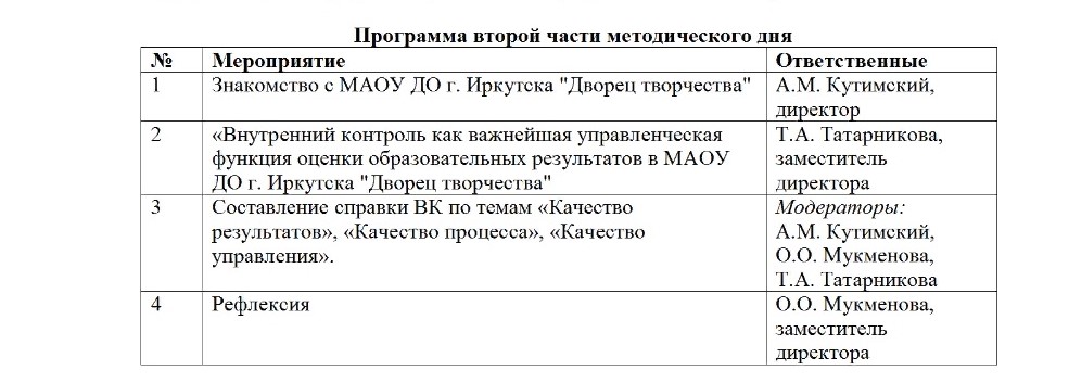 После экскурсии вниманию заместителей директоров по воспитательной работе Т.А. Татарниковой, заместителем директора, была представлена информация по теме «Внутренний контроль как важнейшая управленческая функция оценки образовательных результатов в МАОУ ДО г. Иркутска "Дворец творчества". Татьяна Александровна проговорила об организации образовательной деятельности в Учреждении, которая регламентируется дополнительными общеразвивающими программами (далее по тексту – программы). Программы разрабатываются педагогами дополнительного образования в соответствии с положениями о дополнительной общеразвивающей программе, рабочей программе, адаптированной дополнительной общеразвивающей программе. Татьяна Александровна отметила, что локальные акты в Учреждении разрабатываются в соответствии с ФЗ № 273 от 29.12.2012 г. «Об образовании в Российской Федерации».
