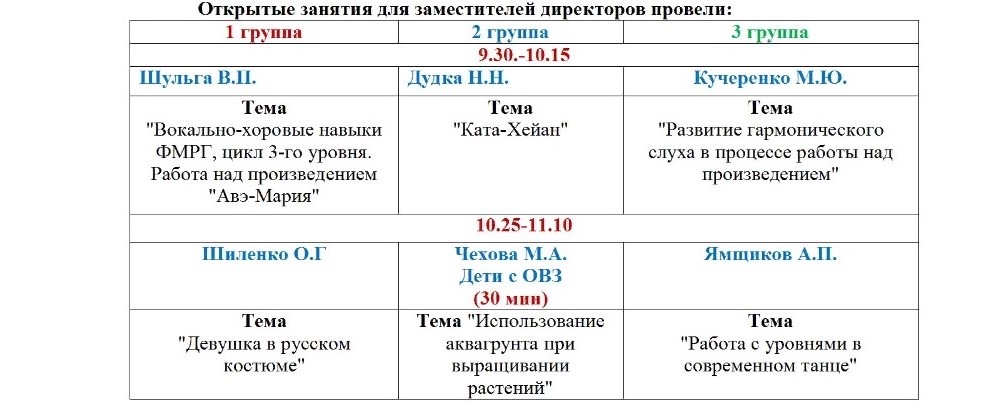 В рамках муниципального проекта «Образовательная весна в г. Иркутске. Новые горизонты 2019» в МАОУ ДО г. Иркутска «Дворец творчества» 13.03.2019г. с 9.30 до 13.00 проведён единый методический день по теме: «Внутренний контроль как важнейшая управленческая функция оценки образовательных результатов». В рамках данного методического мероприятия проведено 9 открытых учебных занятий, из них 6 открытых занятий для заместителей директоров по воспитательной работы общеобразовательных учреждений г. Иркутска: № 35, 46, 55, 63, 64, 53, 57, гимназий №№ 25, 44, лицея № 1 (10), руководитель группы Столова Е.В.; 3 открытых занятия для педагогических работников Учреждения. На мероприятиях методического дня присутствовала Царегородцева Ю. П. – представитель от департамента образования комитета по социальной политике и культуре администрации г. Иркутска.