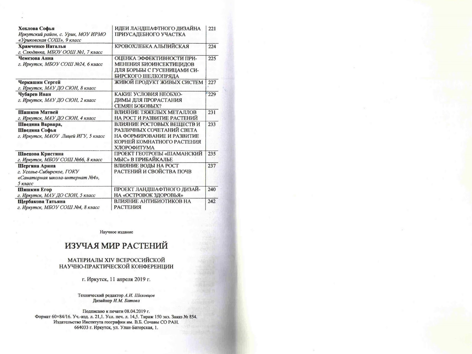 11 апреля 2019 года в технопарке ИРНИТУ прошла XIV Всероссийская научно-практическая конференция Малой Школьной Академии СИФИБР СО РАН «Изучая мир растений».