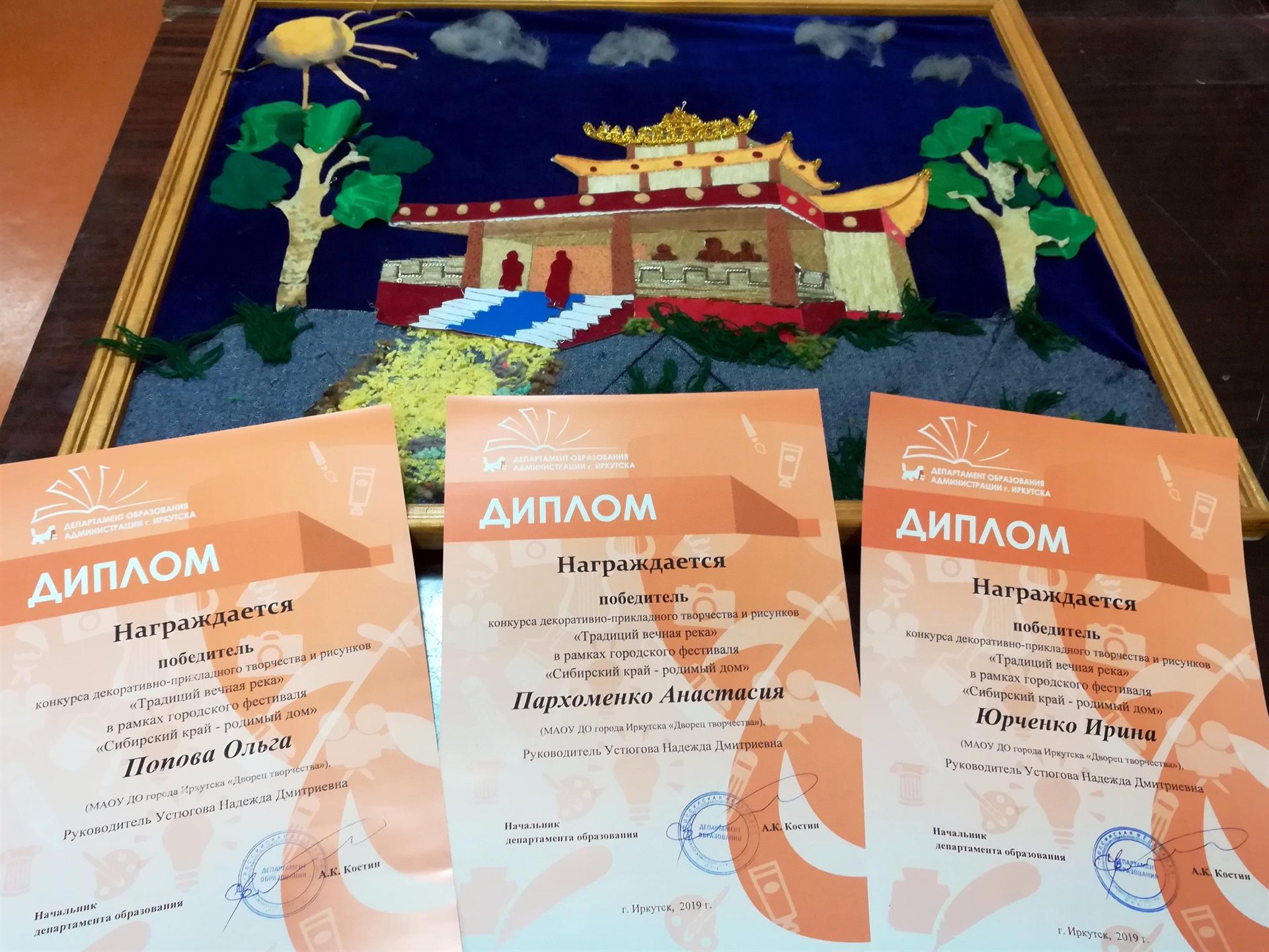 Дворец творчества представляли воспитанники отдела декоративно-прикладного творчества: Гордеева Екатерина – объемная композиция «КБЖД» (участница); а победителями стали: Пархоменко Анастасия, Юрченко Ирина, Попова Ольга – объемная композиция «Усть-Ордынский Дацан».
