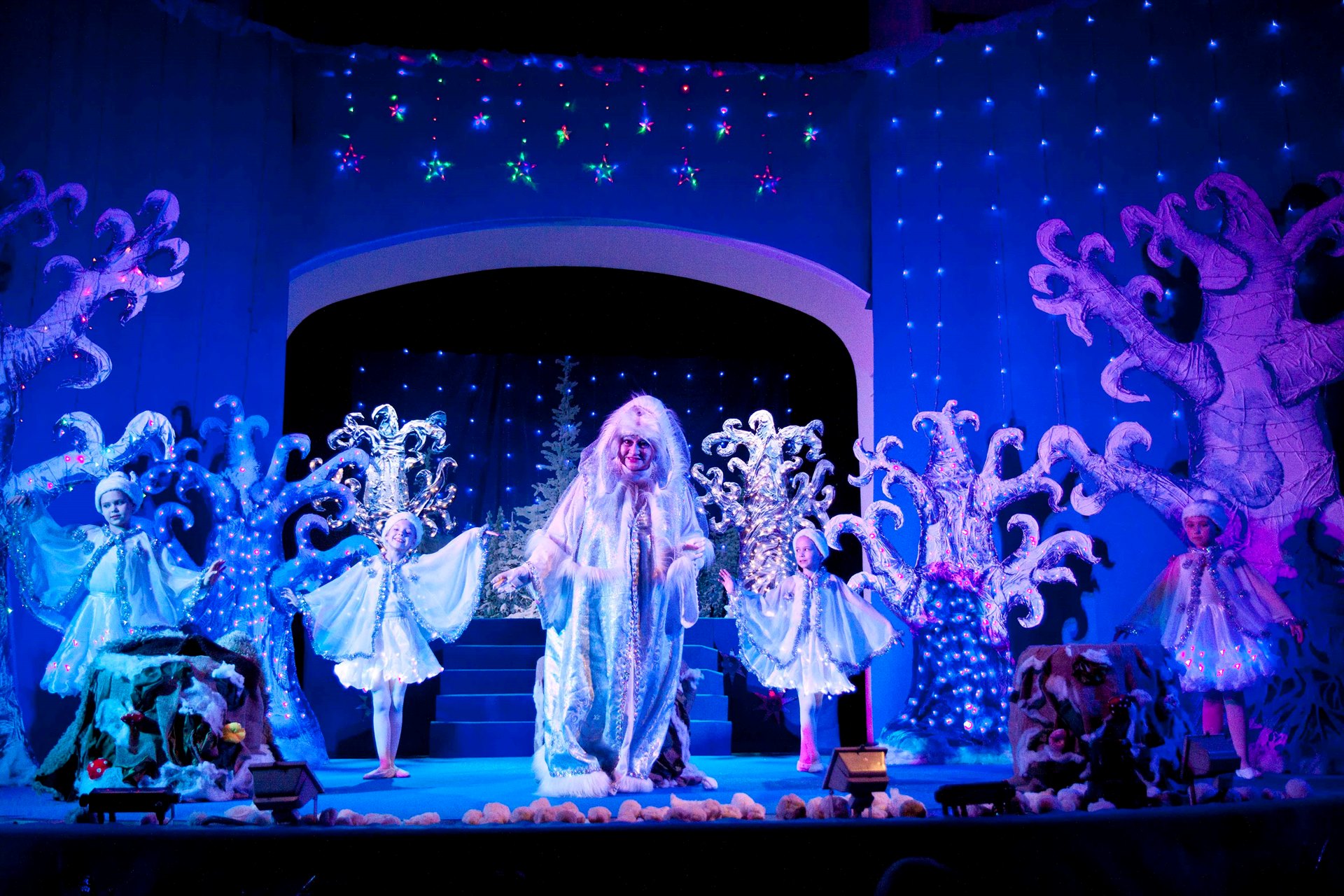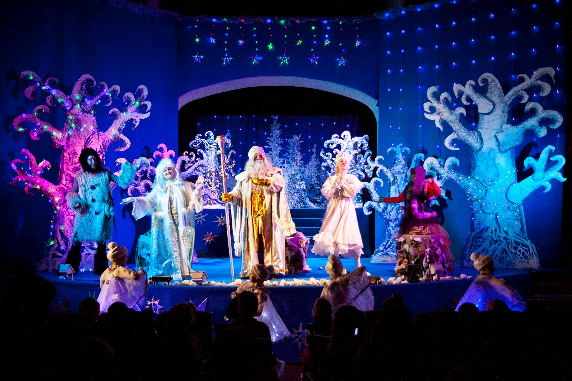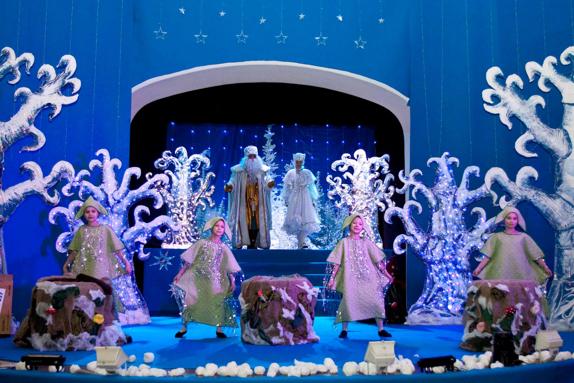Детей встретил интересный и необычный сюжет с перевоплощениями и чудесами. Кощей, Леший, Кикимора и Баба Яга пытаются искоренить добро Дедушки Мороза, Снегурочки и тетушки Метелицы. В миг всё может перевернуться с ног до головы, но итог будет один – добро всегда побеждает зло! В спектакле принимают участие педагоги Дворца творчества, а также юные танцоры школы современного танца «Эдельвейс».