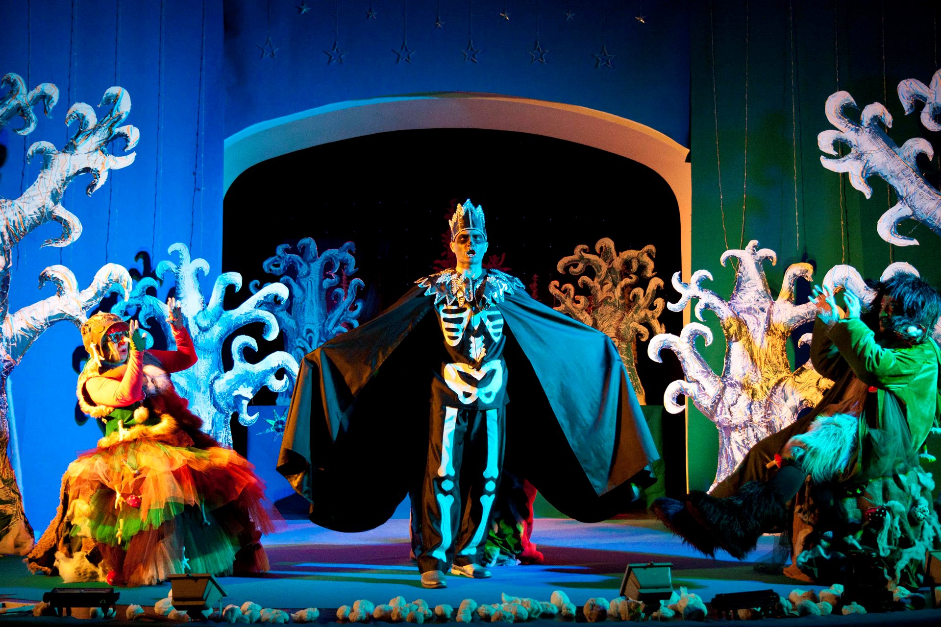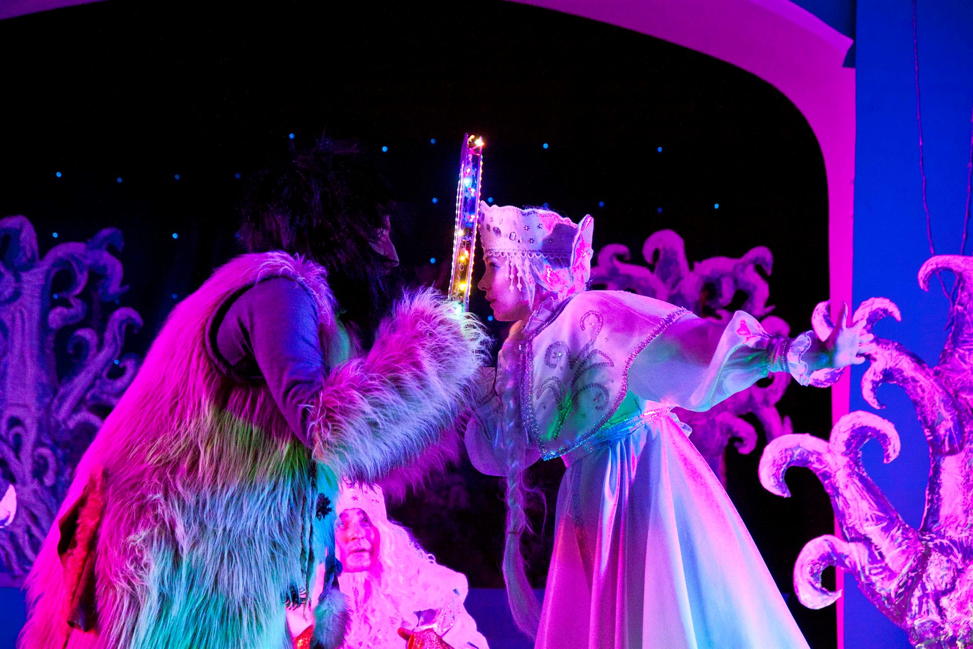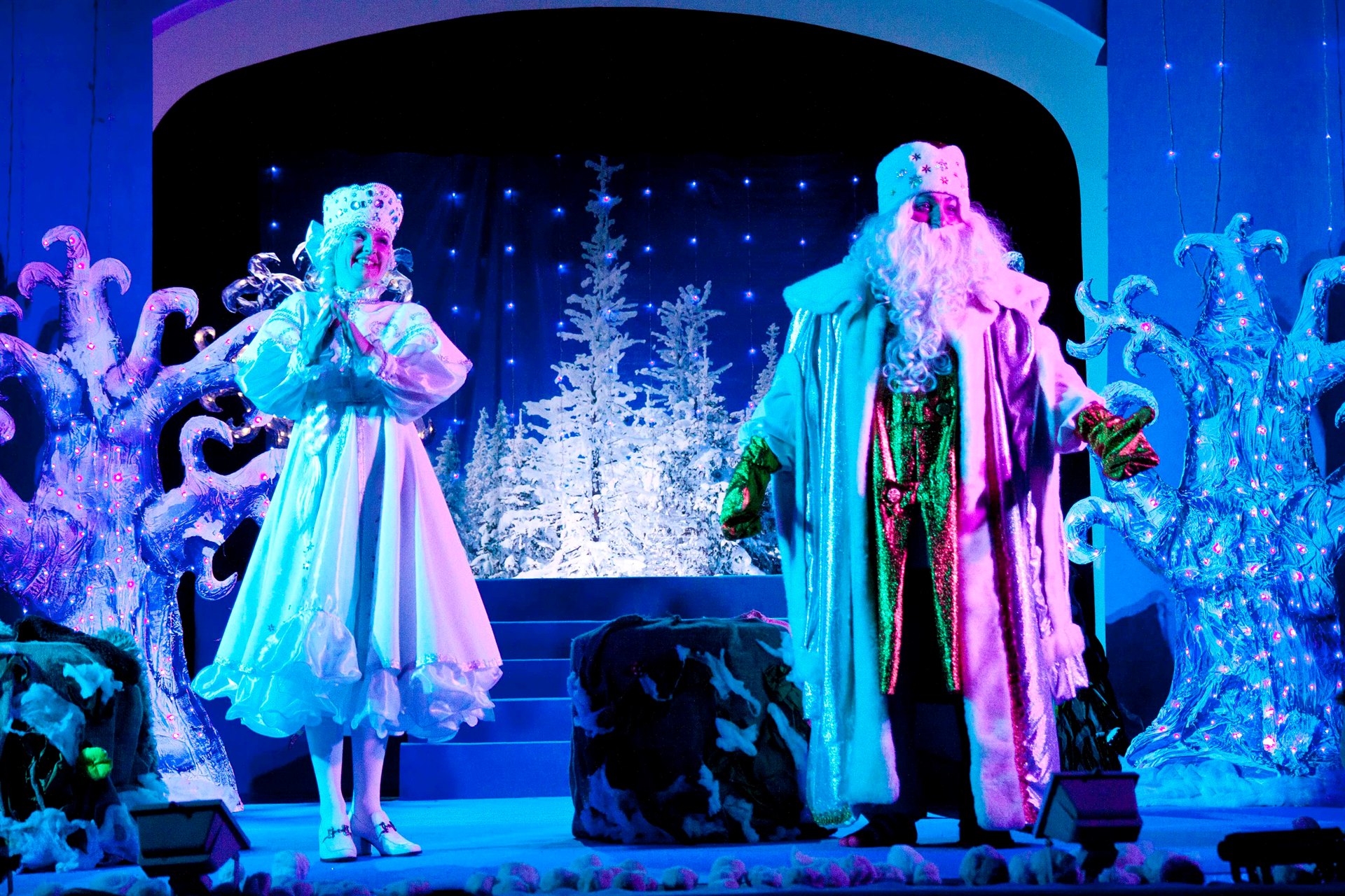 Детей встретил интересный и необычный сюжет с перевоплощениями и чудесами. Кощей, Леший, Кикимора и Баба Яга пытаются искоренить добро Дедушки Мороза, Снегурочки и тетушки Метелицы. В миг всё может перевернуться с ног до головы, но итог будет один – добро всегда побеждает зло! В спектакле принимают участие педагоги Дворца творчества, а также юные танцоры школы современного танца «Эдельвейс».