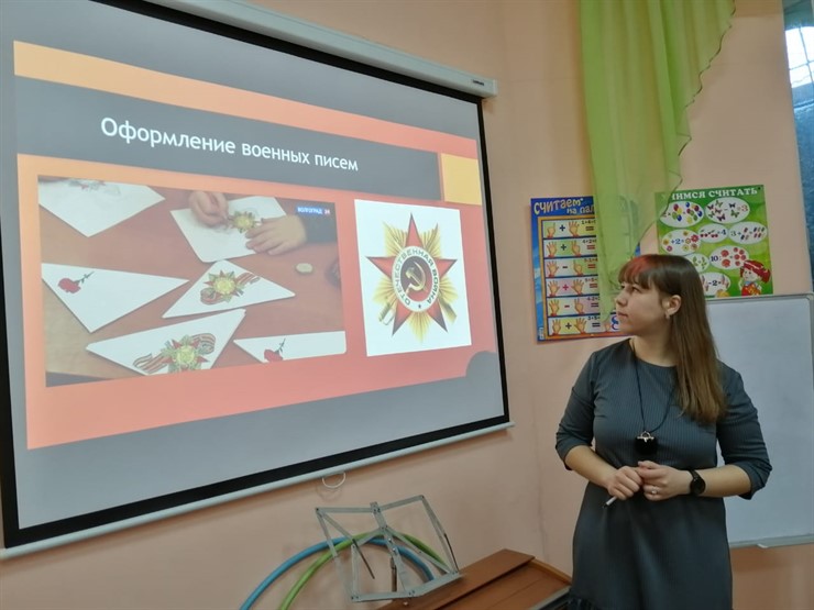 Бондаренко Анастасия Владимировна, педагог дополнительного образования, совместно с руководителем клуба «Зеленая лампа» Тростиной Ниной Валентиновной познакомили детей с художественными произведениями военной тематики, рассказали о полевой почте во время войны. Дети узнали, как жили их сверстники в это тяжёлое время, как писали добрые письма домой своим родным и близким и с нетерпением ждали ответной весточки. Затем дети написали своё письмо на фронт, сложили его в форме треугольника и красочно оформили. А потом все вместе читали стихи и пели песни про подвиг героев Великой Отечественной войны!