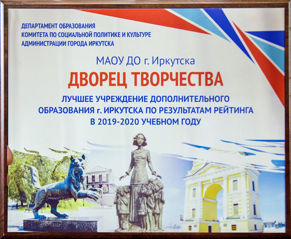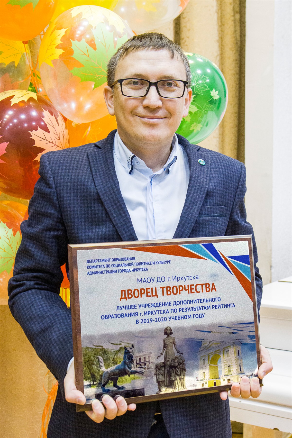 Начальник департамента образования города Иркутска Олег Васильевич Ивкин наградил Дворец творчества в лице директора Антона Михайловича Кутимского за победу в номинации «Лучшее учреждение дополнительного образования г. Иркутска по результатам рейтинга в 2019-2020 учебном году».
