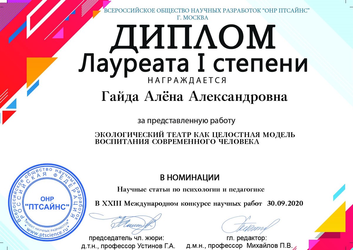 Педагог Дворца творчества Гайда Алёна Александровна стала лауреатом 1 степени в номинации "Научные статьи по психологии и педагогике" со статьей «ЭКОЛОГИЧЕСКИЙ ТЕАТР КАК ЦЕЛОСТНАЯ МОДЕЛЬ ВОСПИТАНИЯ СОВРЕМЕННОГО ЧЕЛОВЕКА».