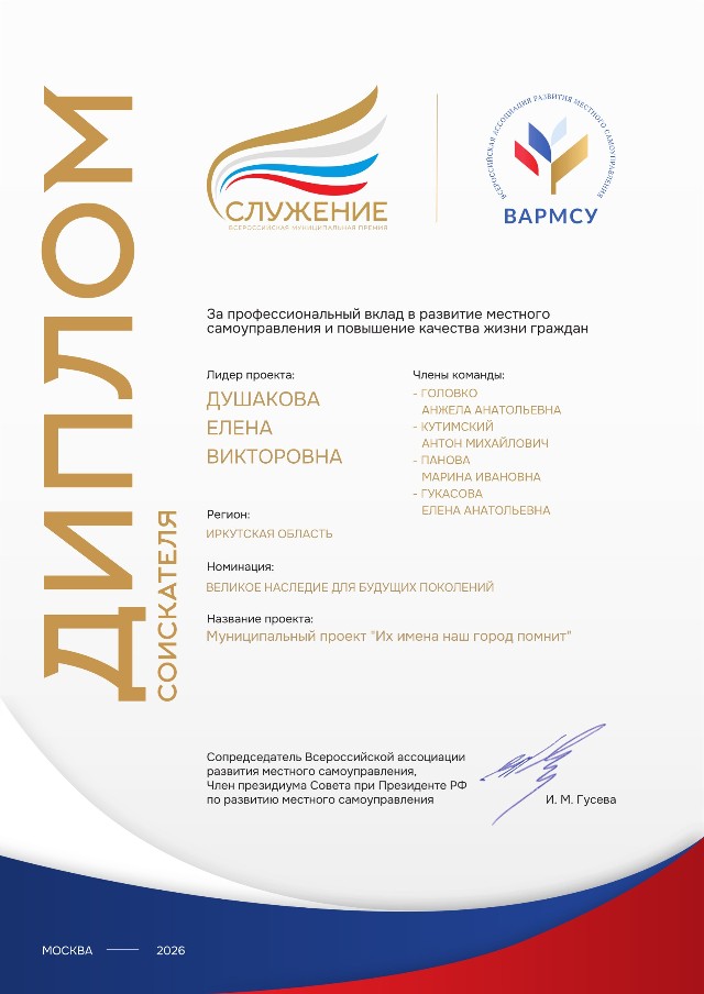 Проект "Их имена наш город помнит" принял участие в III Всероссийской муниципальной премии «Служение», Диплом Соискателя, март, 2026 г.