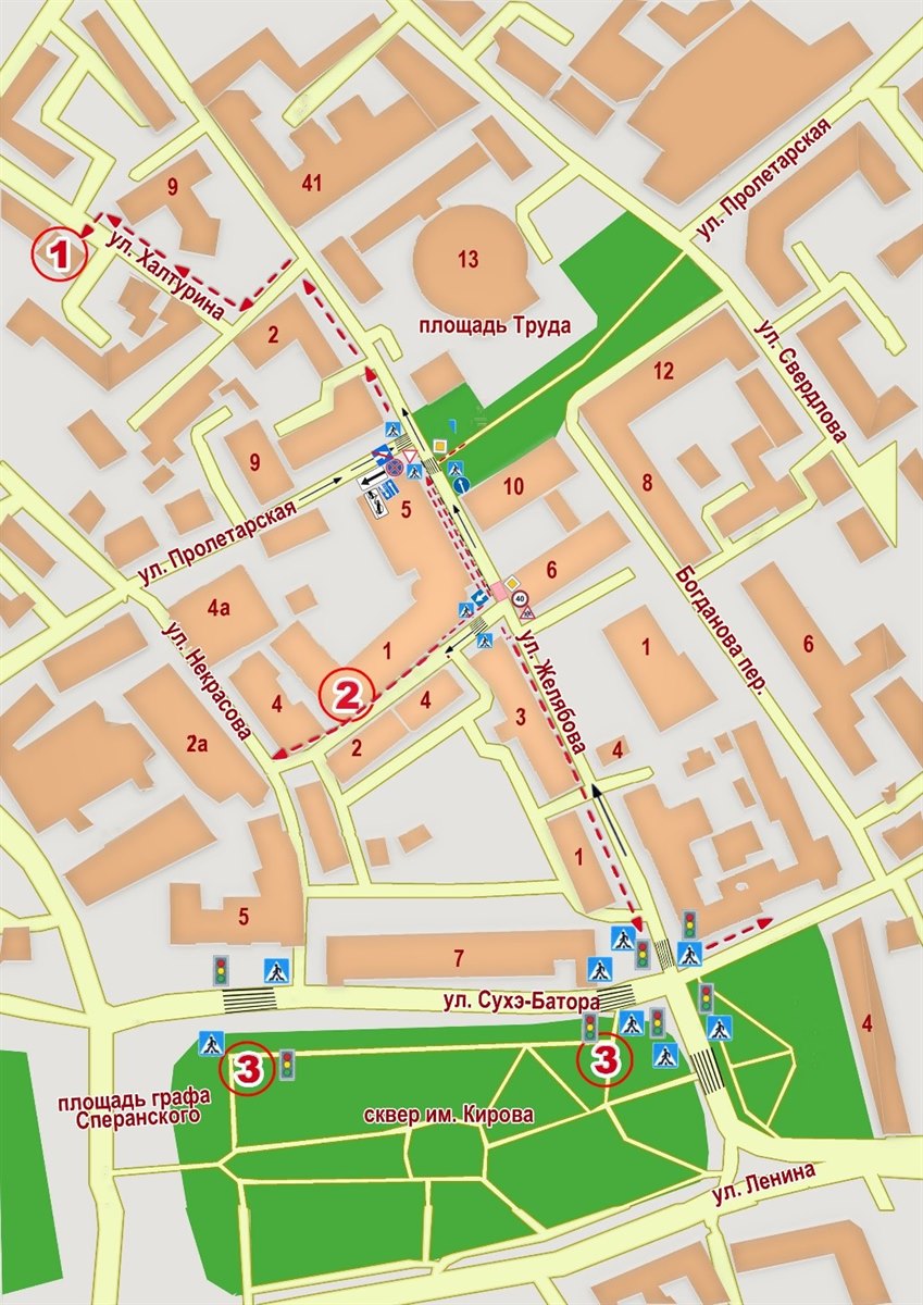 План-схема района расположения Дворца творчества, пути движения транспортных средств и учащихся
