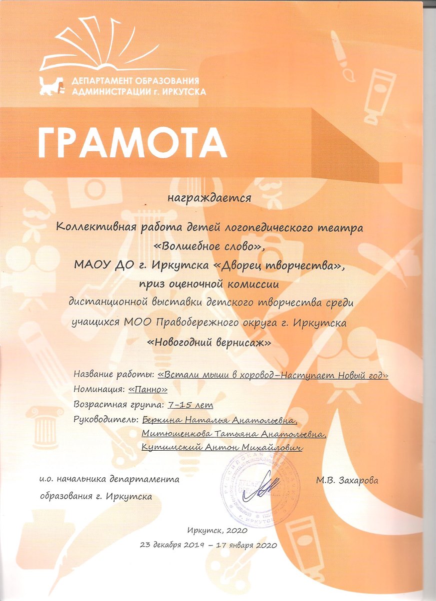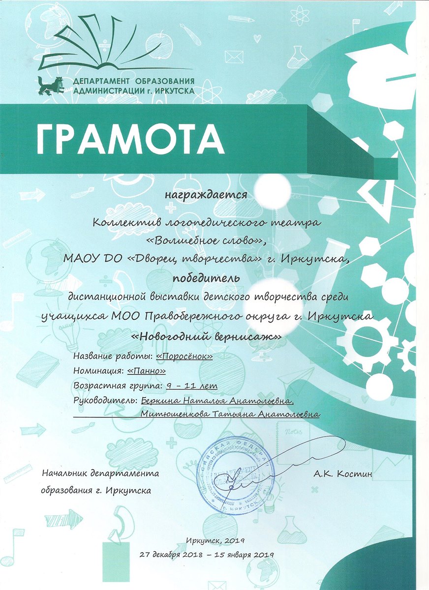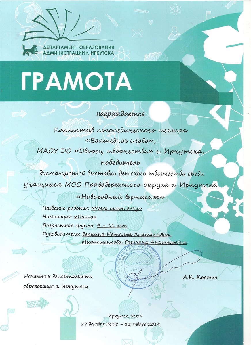 Например, в выставке детского творчества «Новогодний вернисаж» среди учащихся МОО Правобережного округа г. Иркутска (в номинации для детей с ОВЗ) в 2018 году дети получили грамоты за поделки «Умка ищет ёлку» и «Символ года – поросёнок».