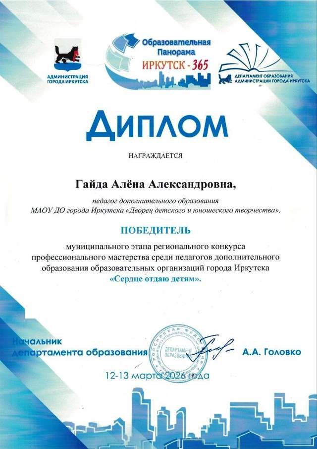 Сердечно поздравляем Гайда Алёну Александровну, педагога дополнительного образования, с заслуженной ПОБЕДОЙ в муниципальном этапе регионального конкурса профессионального мастерства в сфере дополнительного образования «СЕРДЦЕ ОТДАЮ ДЕТЯМ».