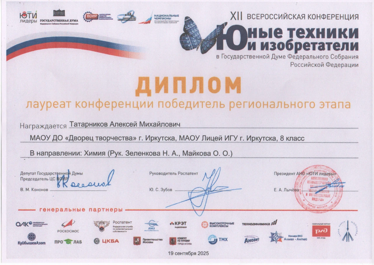 19 сентября в Государственной Думе Федерального Собрания Российской Федерации прошёл финал XII конференции «Юные техники и изобретатели», на котором Алексей представил работу на тему «Определение активного хлора в водопроводной воде города