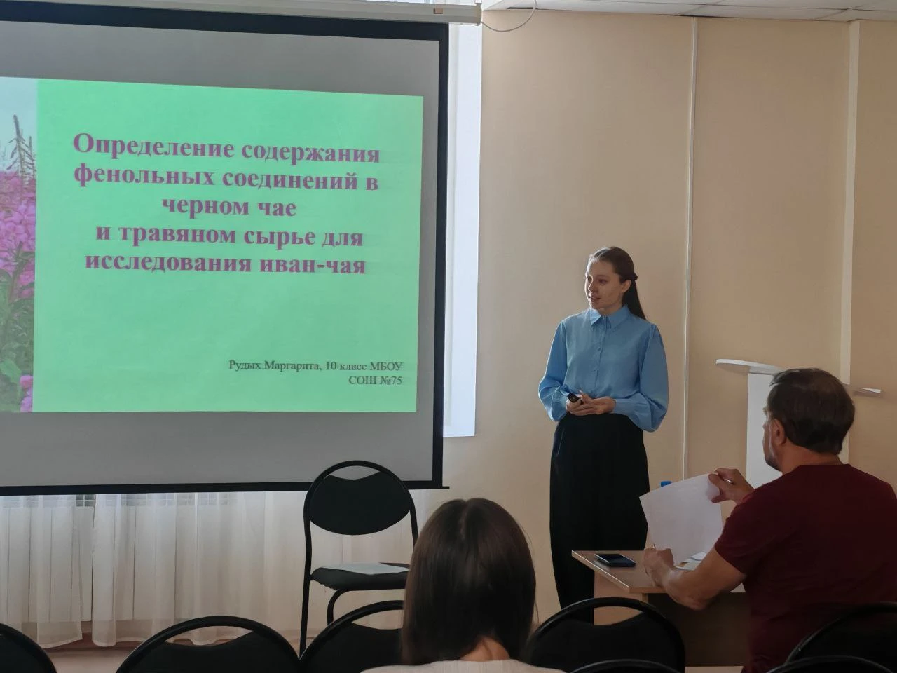 Так Маргарита Рудых представила перед членами экспертного совета работу " Определение содержания фенольных соединений в черном чае и травяном сырье для исследования иван-чая" и получила диплом победителя I степени.