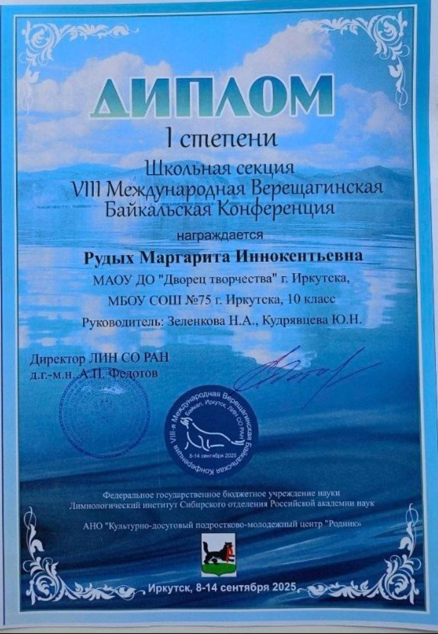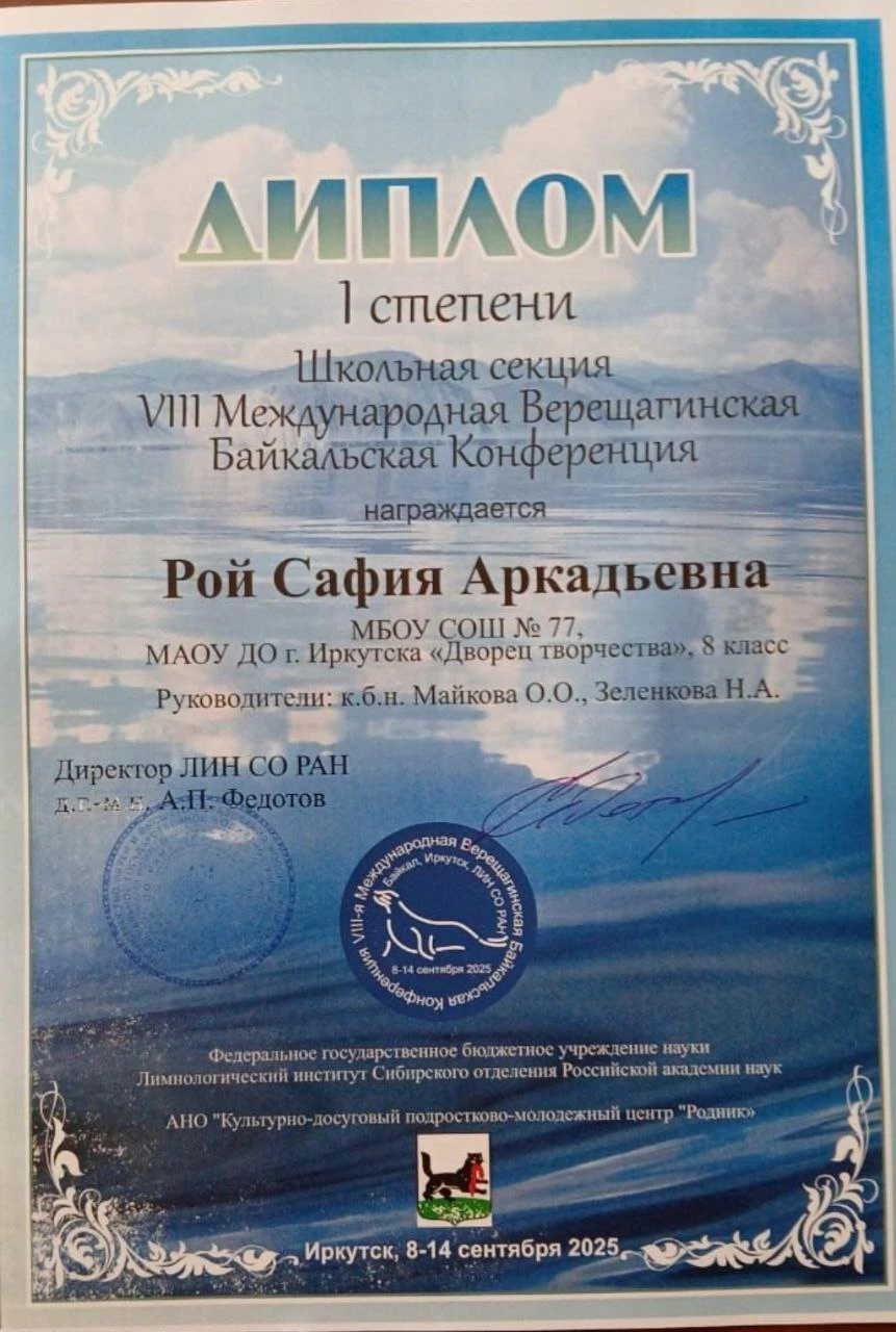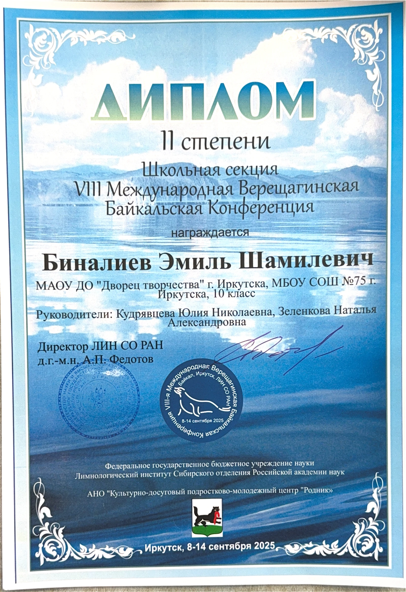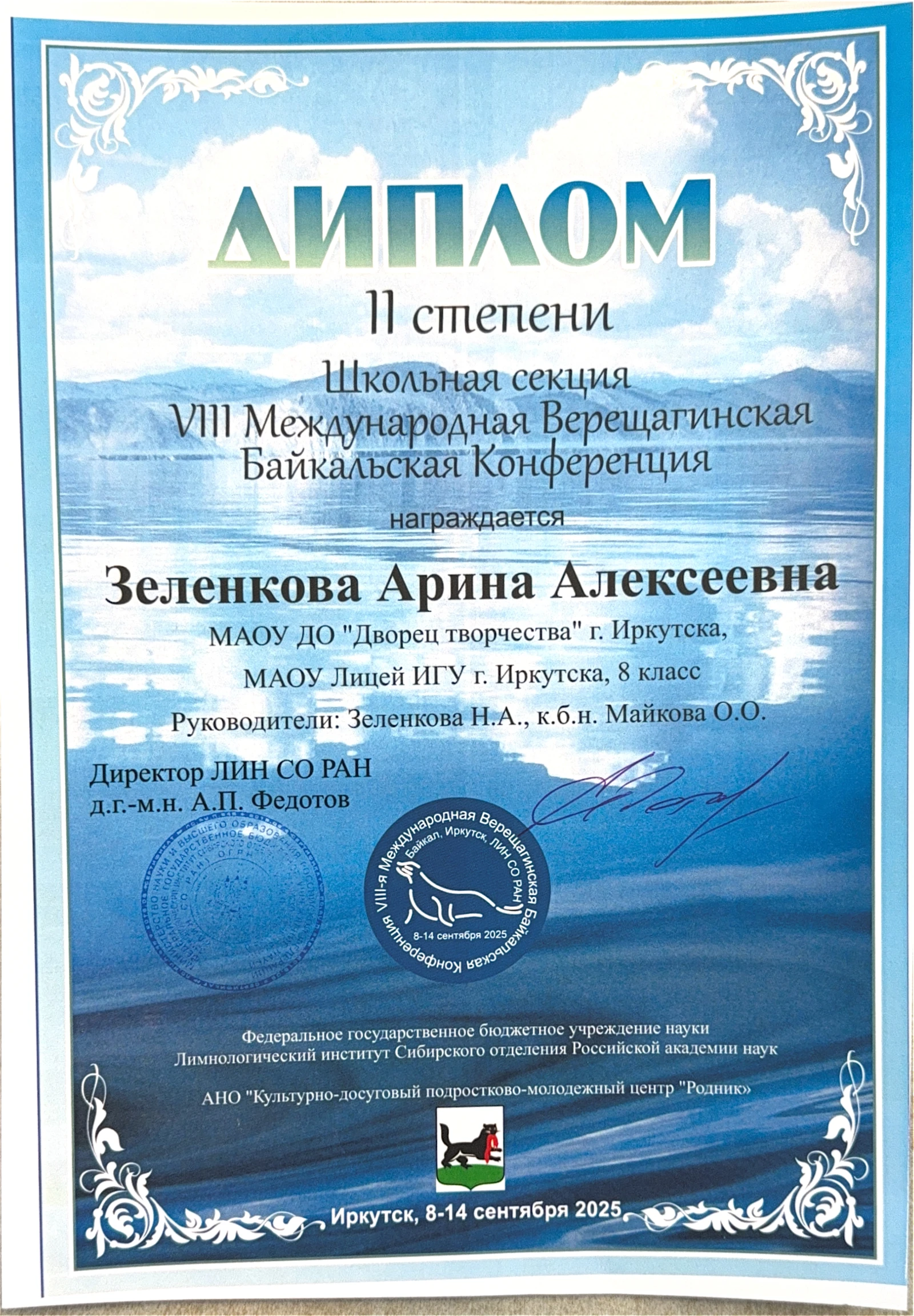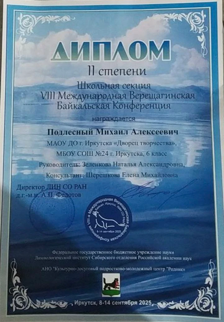 Работа Татарникова Алексея "Определение активного хлора в водопроводной воде города Иркутска" в секции Химия стала первой, а в секции Экология-2 Зеленкова Арина с проектом " Оценка качества среды с помощью флуктуирующей асимметрии березы повислой" получила диплом II степени.