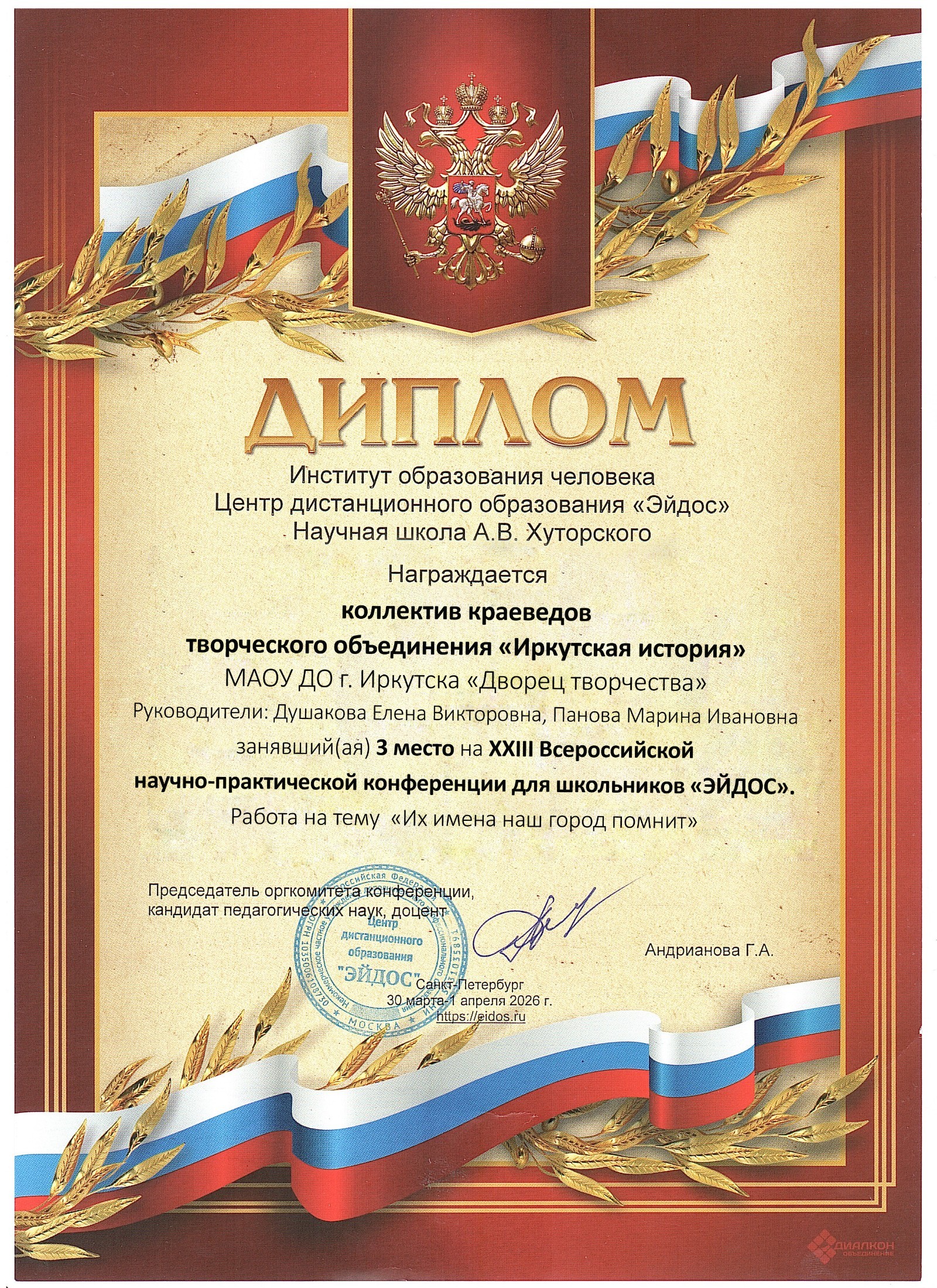 Проект "Их имена наш город помнит" творческого объединения "Иркутская история" в апреле 2025 года стал призером в секции "Маленькие исследователи окружающего мира" на XXI городской научно-практической конференции младших школьников «Самое доброе исследование» (ссылка)