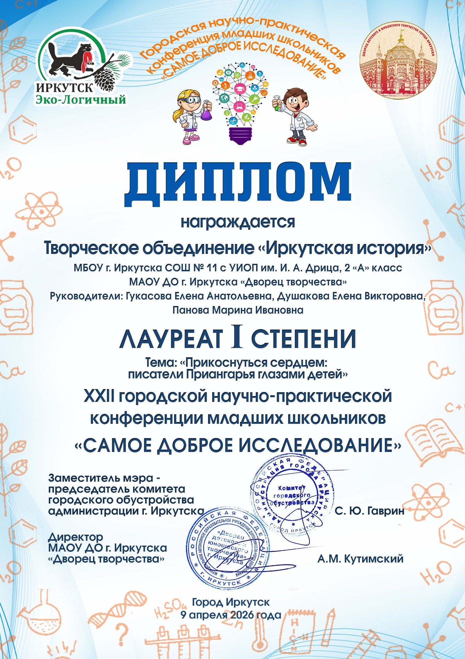 Проект "Прикоснуться сердцем: писатели Приангарья глазами детей" творческого объединения "Иркутская история" в апреле 2026 года стал Лауреатом 1 степени на XXII городской научно-практической конференции младших школьников «Самое доброе исследование» (ссылка)