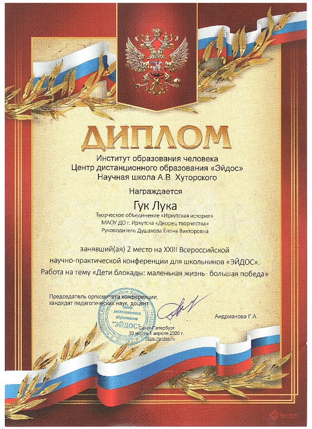 Проект "Маленькие герои большой войны: взгляд новых поколений" был представлен на XXIII Всероссийской научно-практической конференции для школьников "Эйдос", диплом за 2 место, 30 марта-1 апреля 2026 г., г. Санкт-Петербург