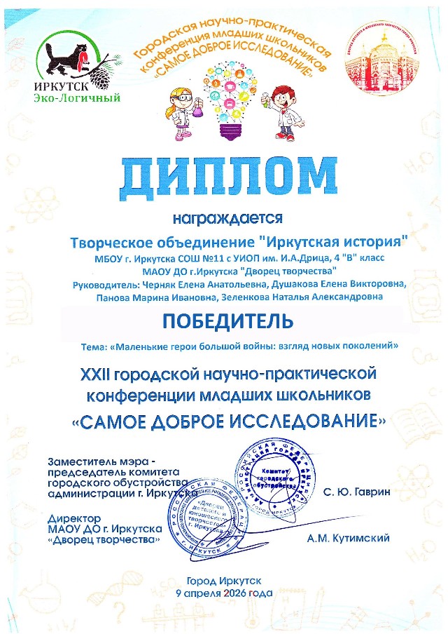 Проект "Маленькие герои большой войны: взгляд новых поколений" творческого объединения "Иркутская история" в апреле 2026 года стал ПОБЕДИТЕЛЕМ на XXiI городской научно-практической конференции младших школьников «Самое доброе исследование» (ссылка)