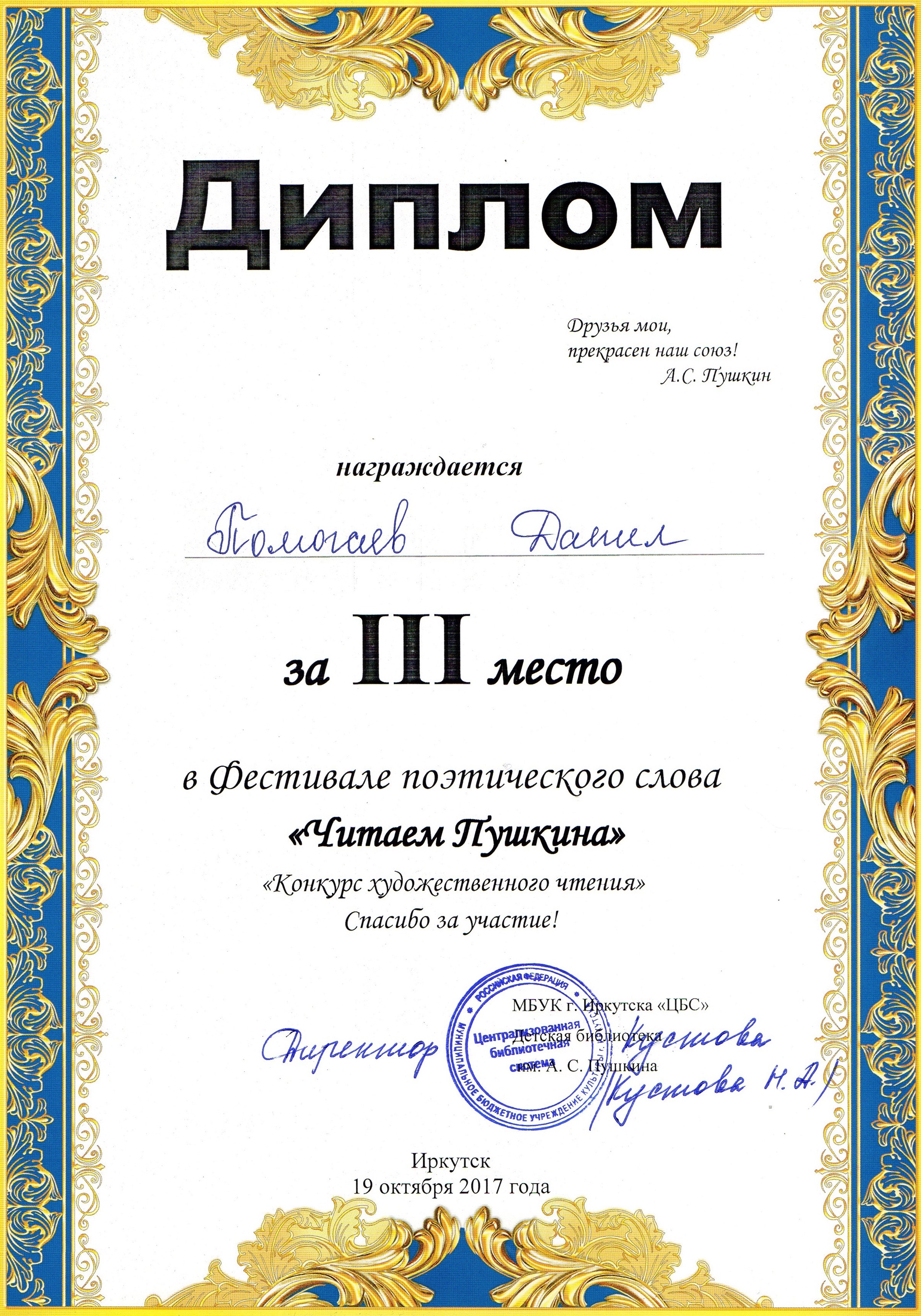 Поздравляем Помогаева Данила - призера регионального фестиваля поэтического слова "Читаем Пушкина" в номинации "Конкурс художественного чтения"