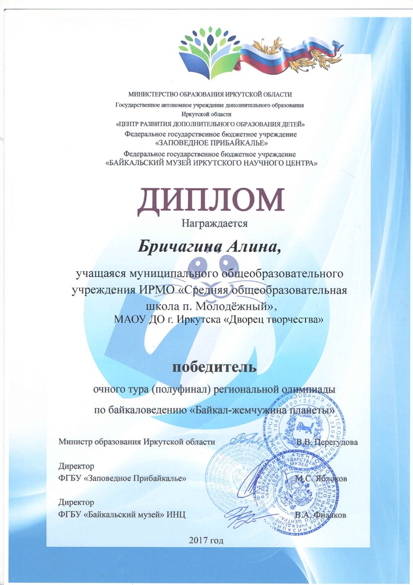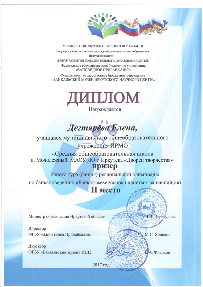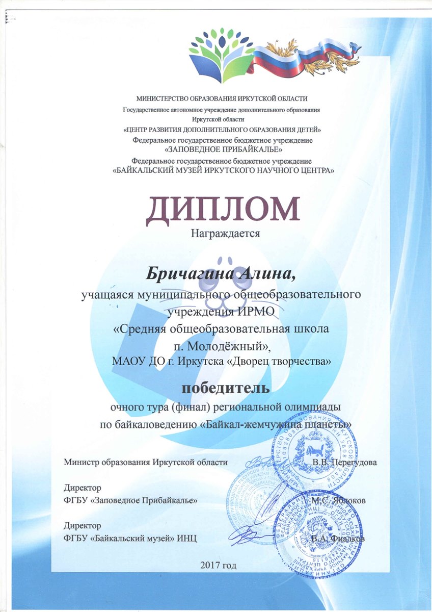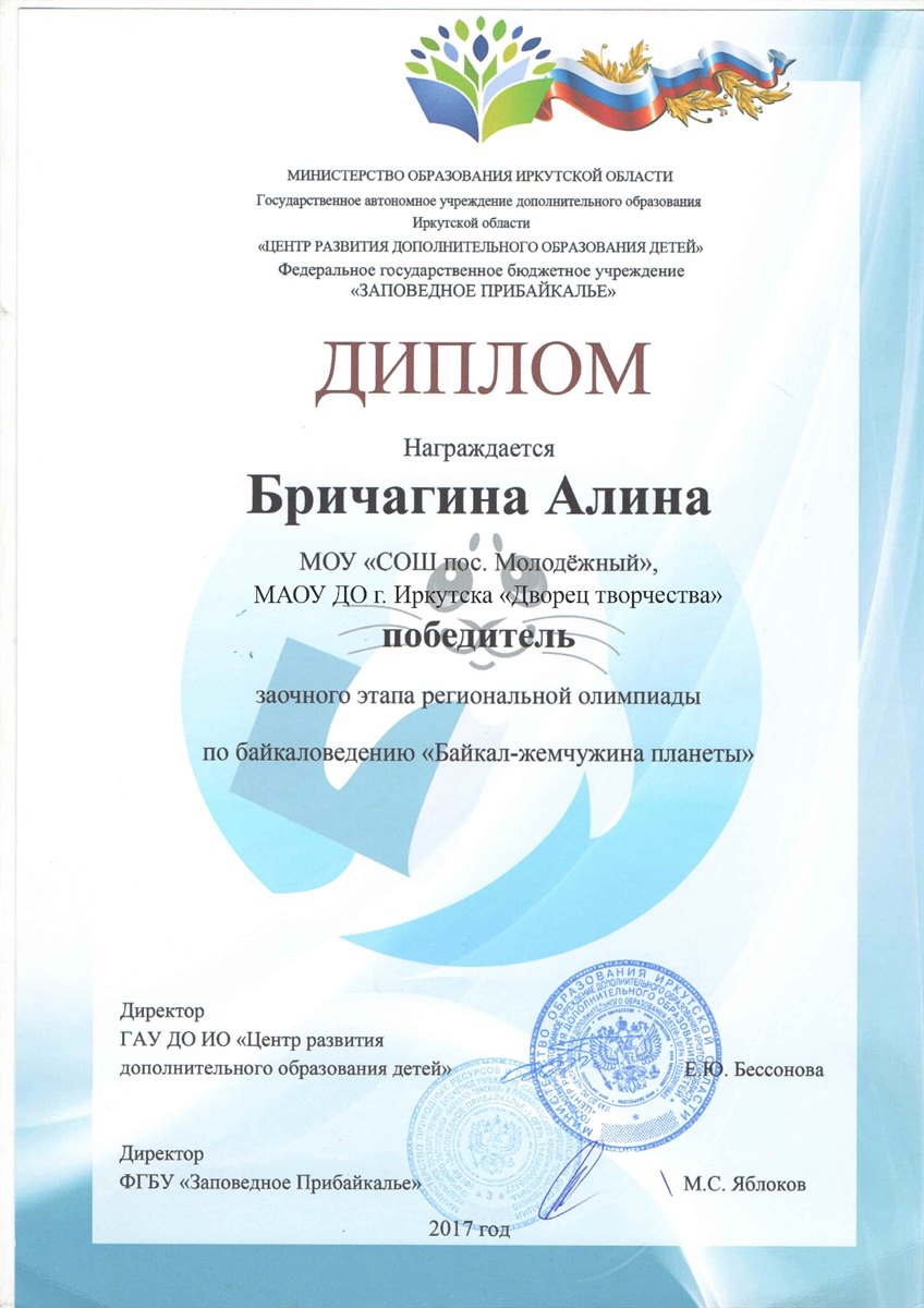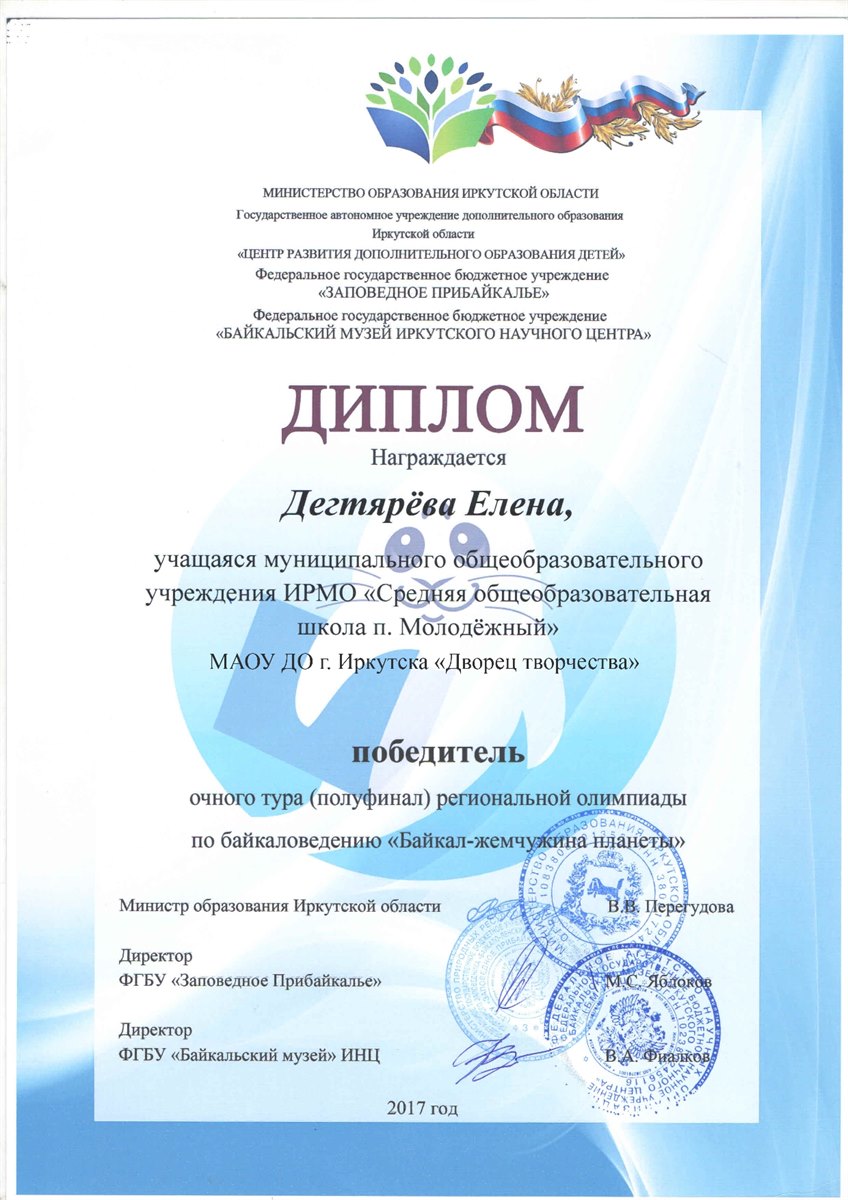С 30 октября по 1 ноября 2017 года в п. Листвянка прошла региональная олимпиада по байкаловедению "Байкал – жемчужина планеты". В финал олимпиады по итогам двух туров вышли 8 обучающихся из образовательных организаций Иркутской области. В число финалистов вошли обучающиеся средней школы п. Молодежный и "Дворца творчества" г. Иркутска. Во время проведения олимпиады юные байкаловеды смогли не только проверить свои знания, но и увлекательно и познавательно провести свое время в Байкальском музее. Во время проведения экскурсии по музею финалистам олимпиады представилась возможность изучить тайны Байкала под микроскопом и, даже погрузиться на дно великого озера. Участники олимпиады высказали свою обеспокоенность экологическим состоянием Байкала и на деле при помощи создания и защиты экологических проектов по названием "Чистый берег" доказали это. По итогам олимпиады в число победителей и призеров вошли: Бричагина Алина, завоевавшая кубок за 1 место и Дегтярева Елена, занявшая 2 место. Алина и Елена, обучающиеся студии "Зеленый пазл" "Дворца творчества" г. Иркутска и СОШ п. Молодежный. Руководитель – педагог дополнительного образования МАОУ ДО г. Иркутска «Дворец творчества» Кузьменко А.А..