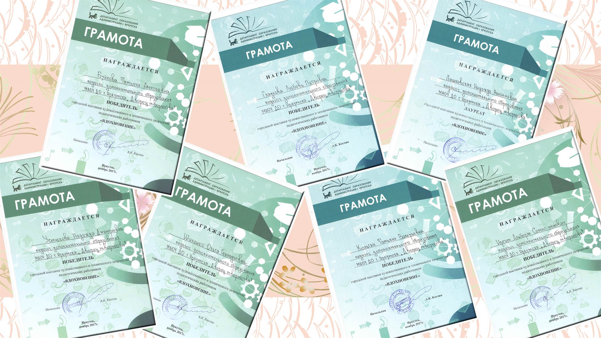 Поздравляем победителей и лауреатов городской выставки художественного и технического творчества педагогических работников "Вдохновение" – педагогов отдела декоративно-прикладного и технического творчества Дворца: Иргит А.С., Пашковскую Н.Н., Гладкову Л.П., Устюгову Н.Д., Буйкову Т.А., Шиленко О.Г., Кольган Т.В.!
