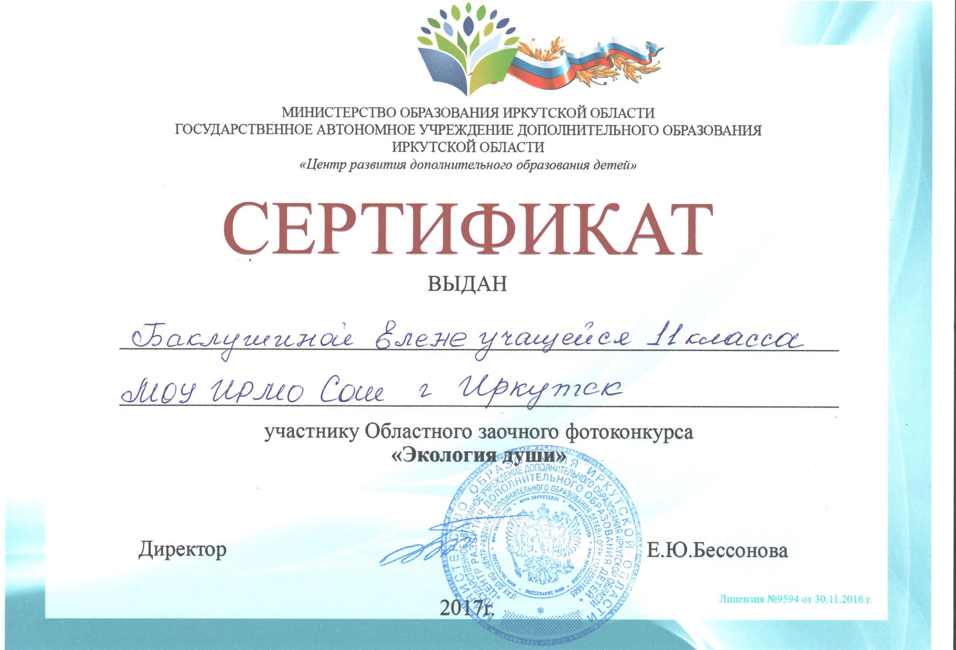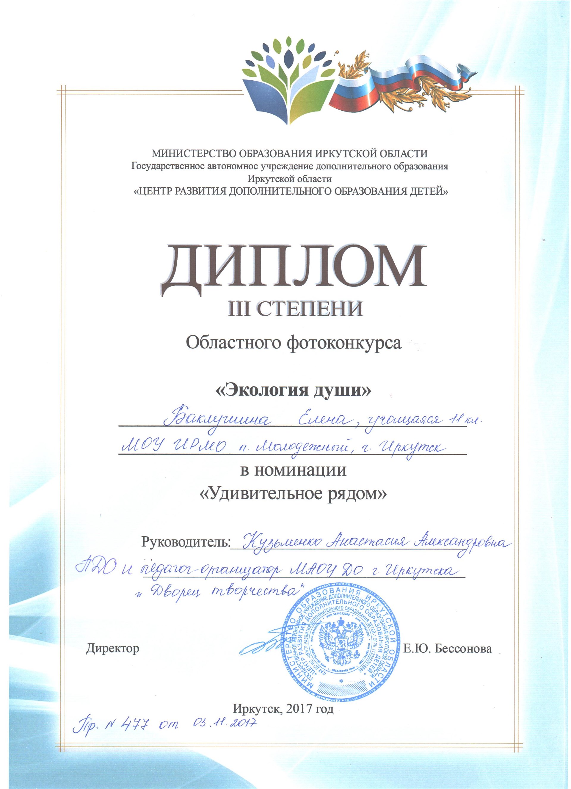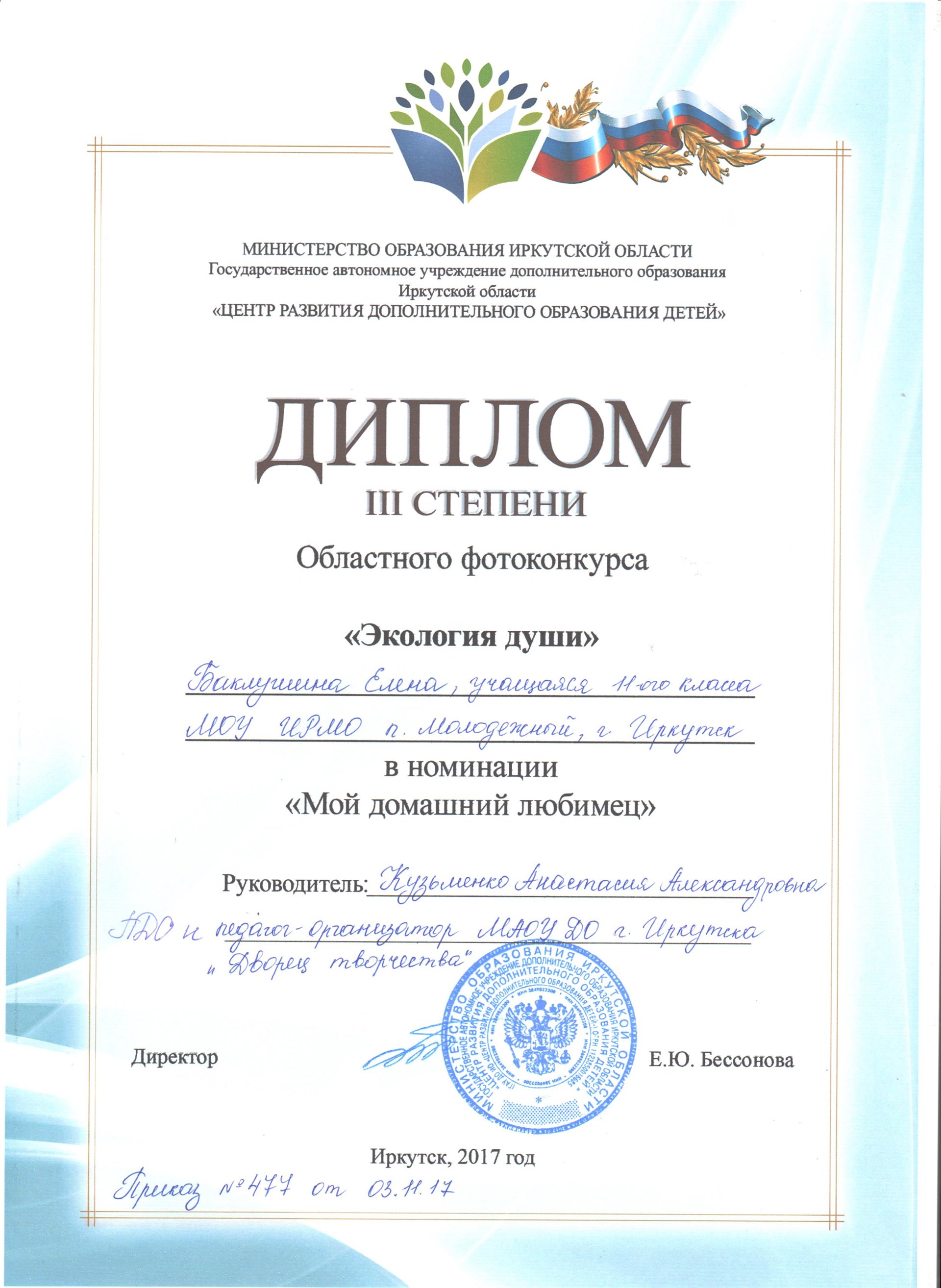 Поздравляем дипломанта 3 степени областного фотоконкурса «Экология души» Баклушину Елену (педагог Кузьменко А.А.)!