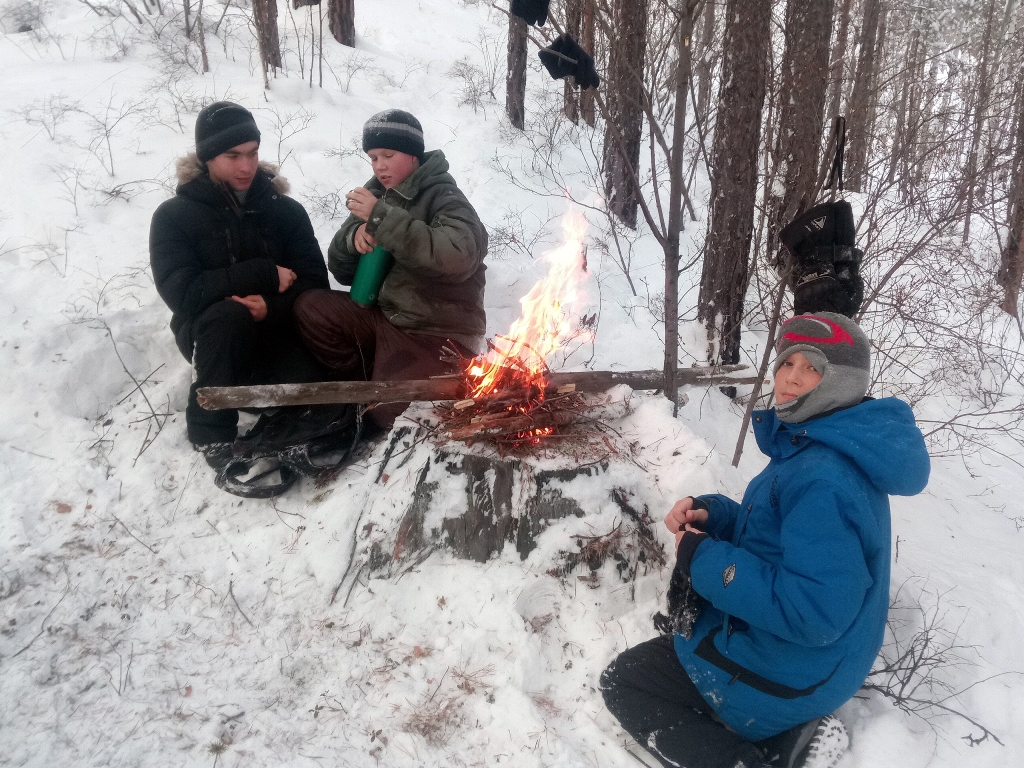 Костер решили разводить на старом пне, чтобы он не проваливался в снег. Результат: костёр горит, хлеб жариться, сало вялиться, тело греется, одежда сушится. Наевшись и согревшись, мы выдвинулись в сторону станции.