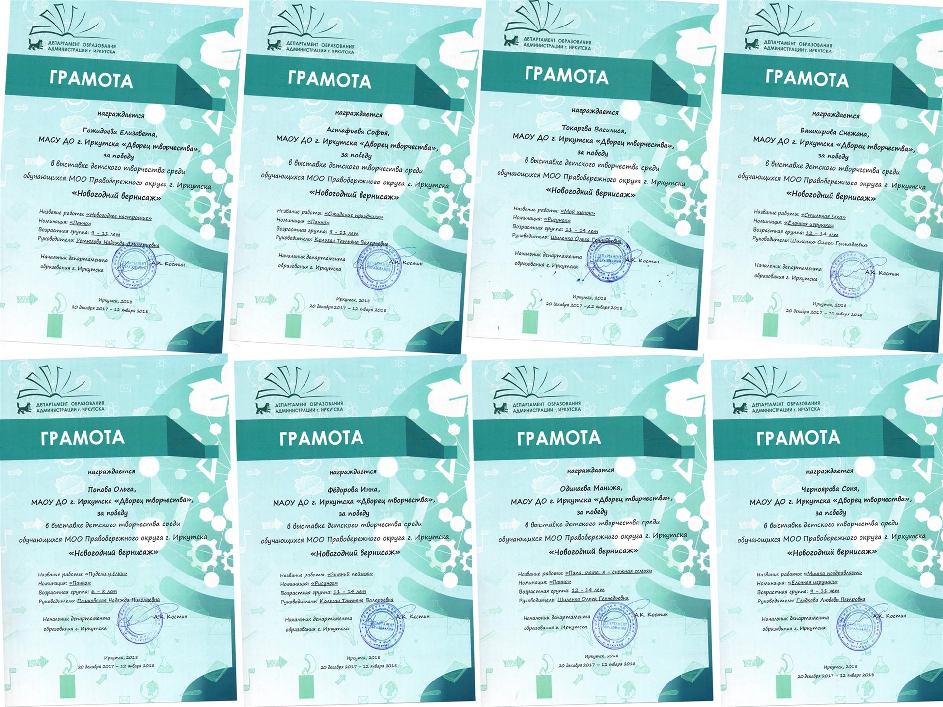 С 22 декабря 2017 года по 15 января 2018 года в филиале МБУК «Музей истории города Иркутска им. А.М. Сибирякова» и в Городском выставочном центре им. В.С. Рогаля прошла выставка детского творчества среди обучающихся Правобережного округа «Новогодний вернисаж».