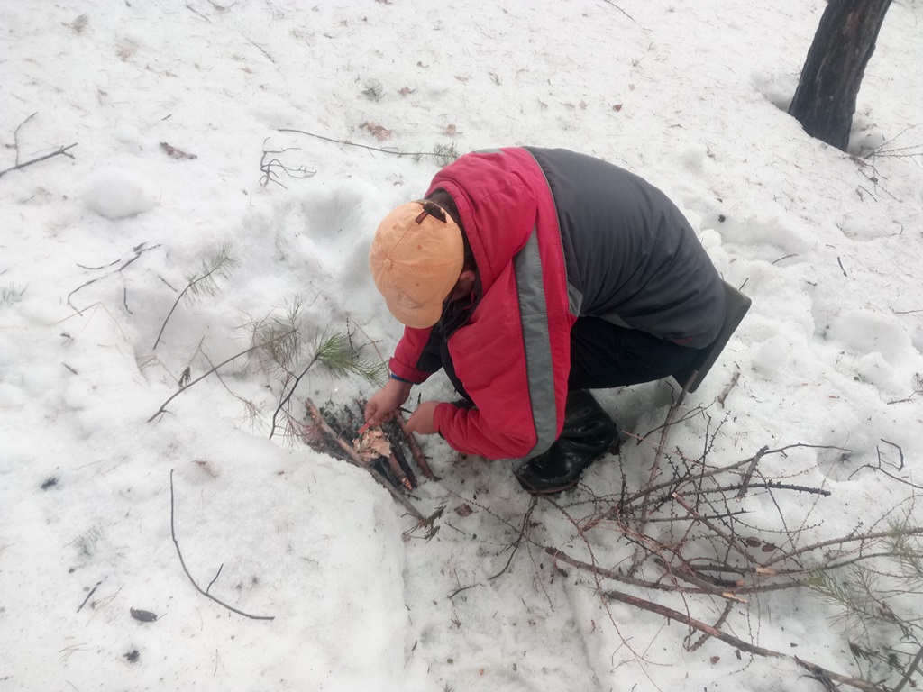 Пока закипала вода, мы решили прибраться немного на стоянке. Собрали все фантики, бумажки и целлофан, которые вылезли как подснежники после таяния снега. Безусловно, этого мало, так как большая часть мусора еще лежит под снегом, но, по крайней мере, после нашего эко-рейда, вид на стоянке стал намного лучше и чище. Конечно, сюда надо прийти недели через две, когда полностью сойдет снег, и навести полноценный порядок: собрать и сжечь весь мусор, который был принесен людьми из города, а также остался от заготовки дров.