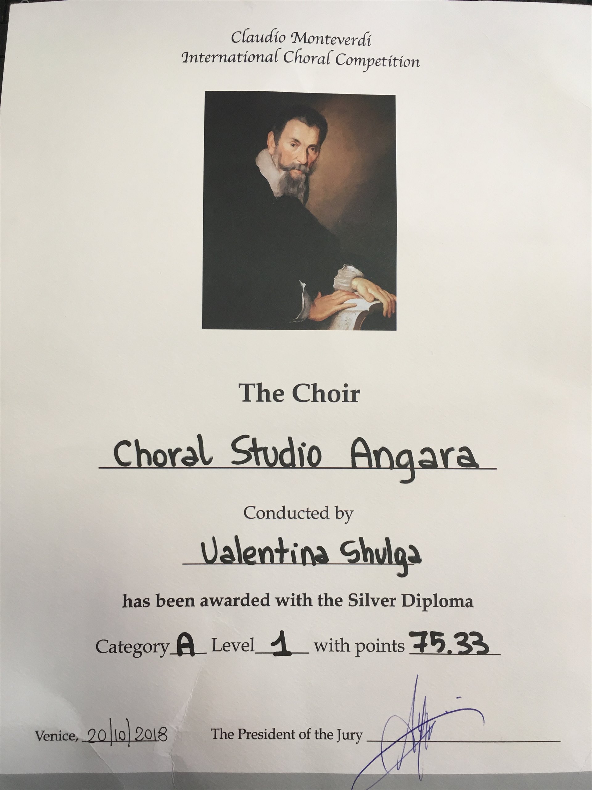 Поздравляем хоровую студию «Ангара» и её руководителя, Шульгу Валентину Петровну, с победой на международном хоровом конкурсе-фестивале имени Клаудио Монтеверди (великого композитора XVII века), который проходил с 18 по 21 октября в городе Венеция (Италия).