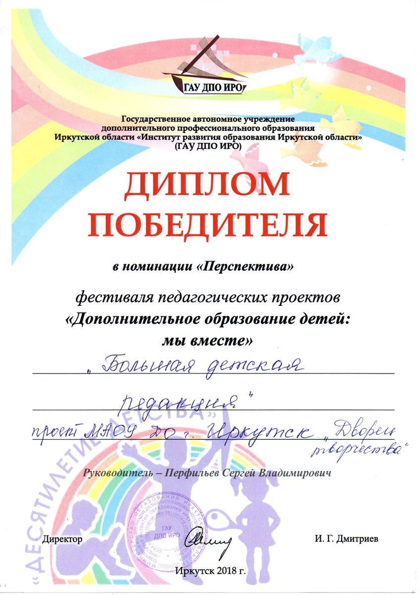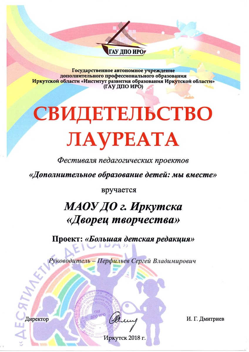- «Большая детская редакция», МАОУ ДО г. Иркутска «Дворец творчества».
