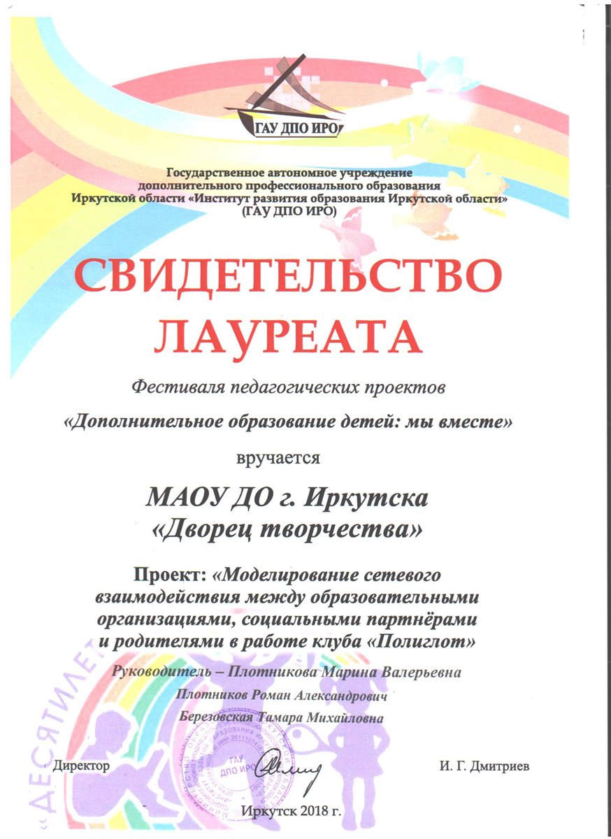 - «Моделирование сетевого взаимодействия между образовательными организациями, социальными партнёрами и родителями в работе клуба «Полиглот», МАОУ ДО г. Иркутска «Дворец творчества».