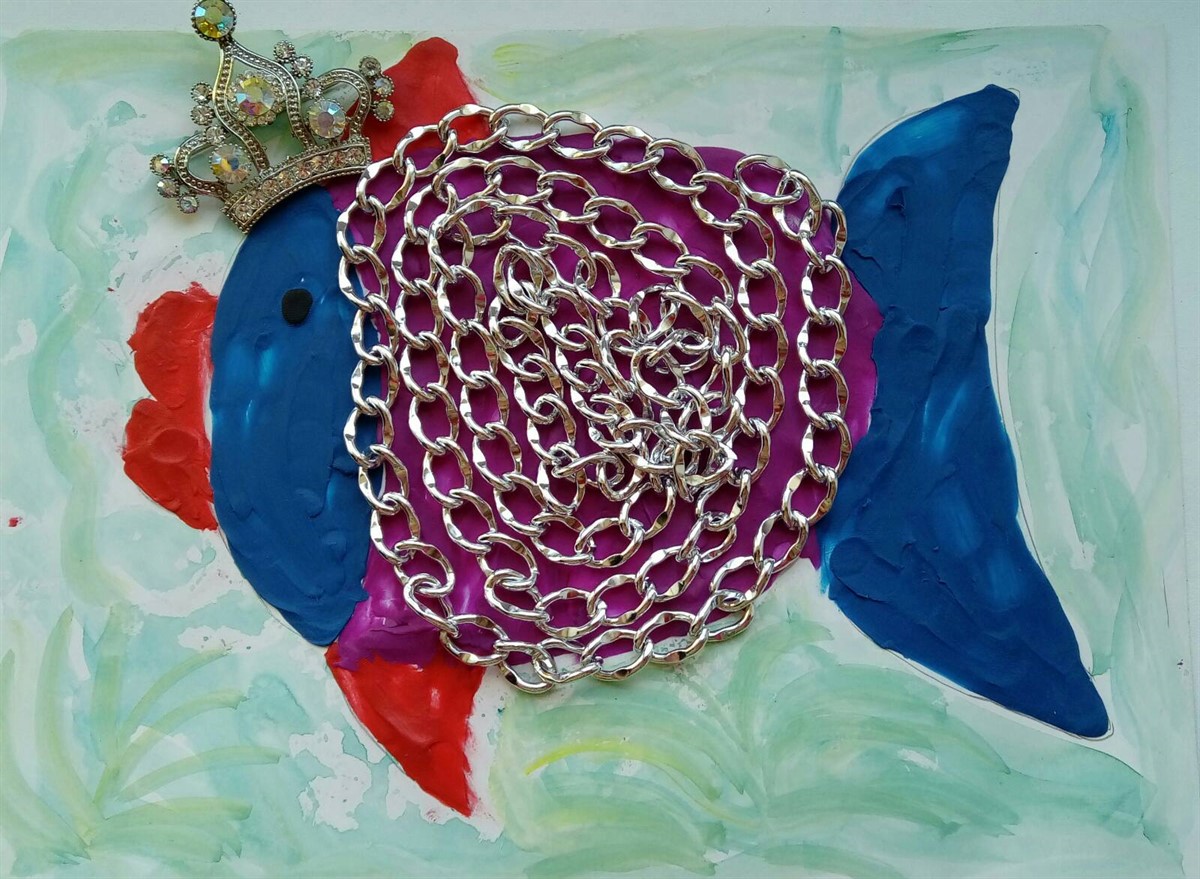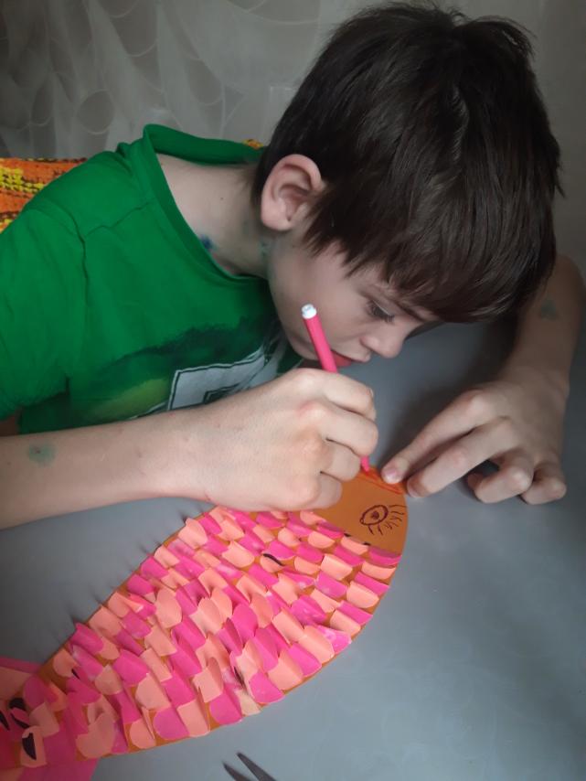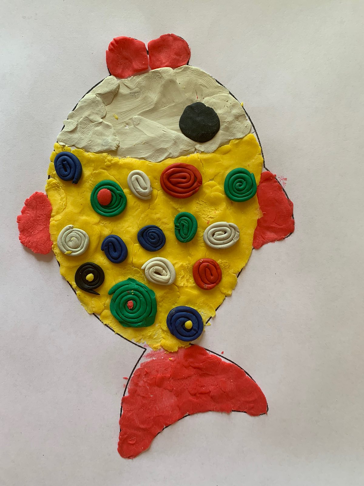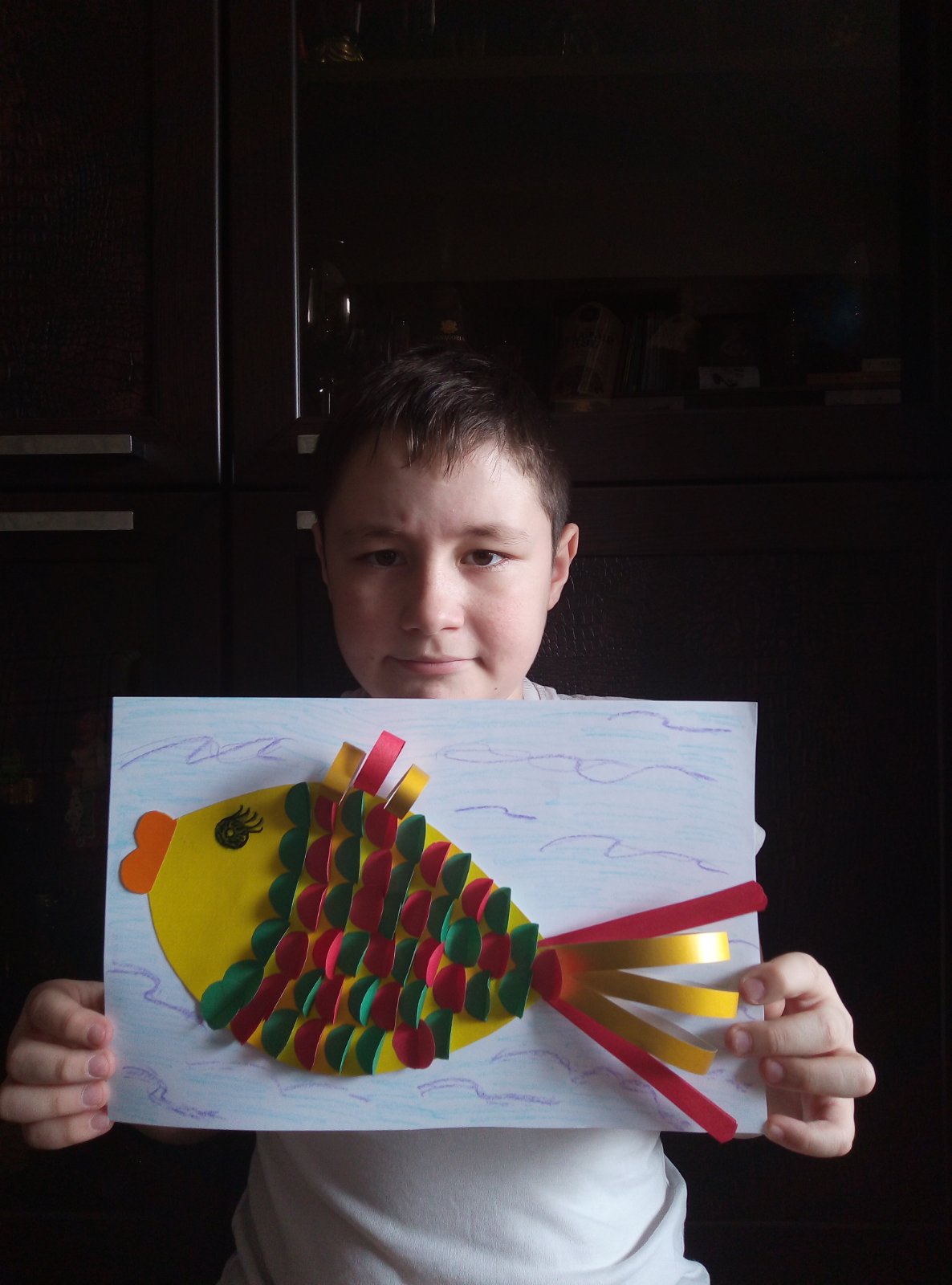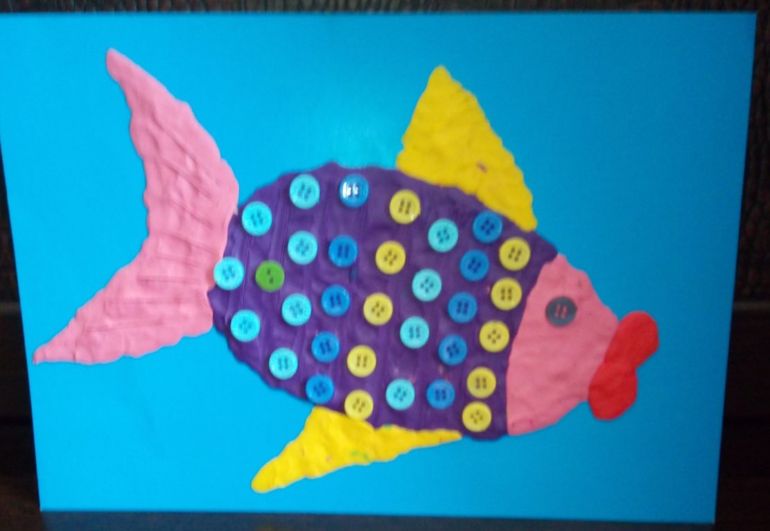 У мальчишек рыбная тема: объёмная аппликация из бумаги и пластилинография, работы украшенные различными способами (пуговицы, бусы, цепочки и т.д.)