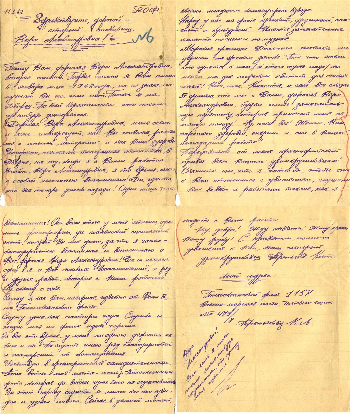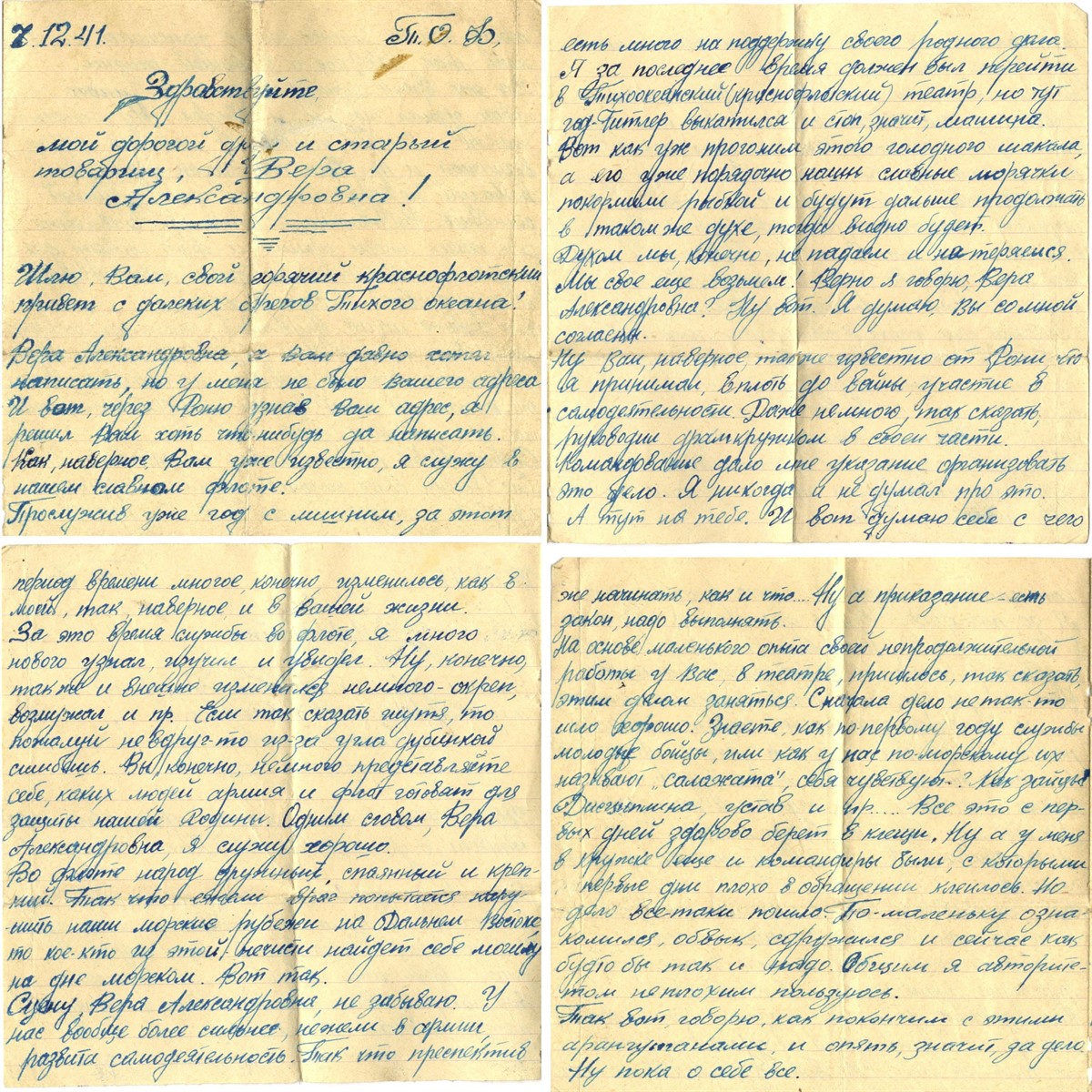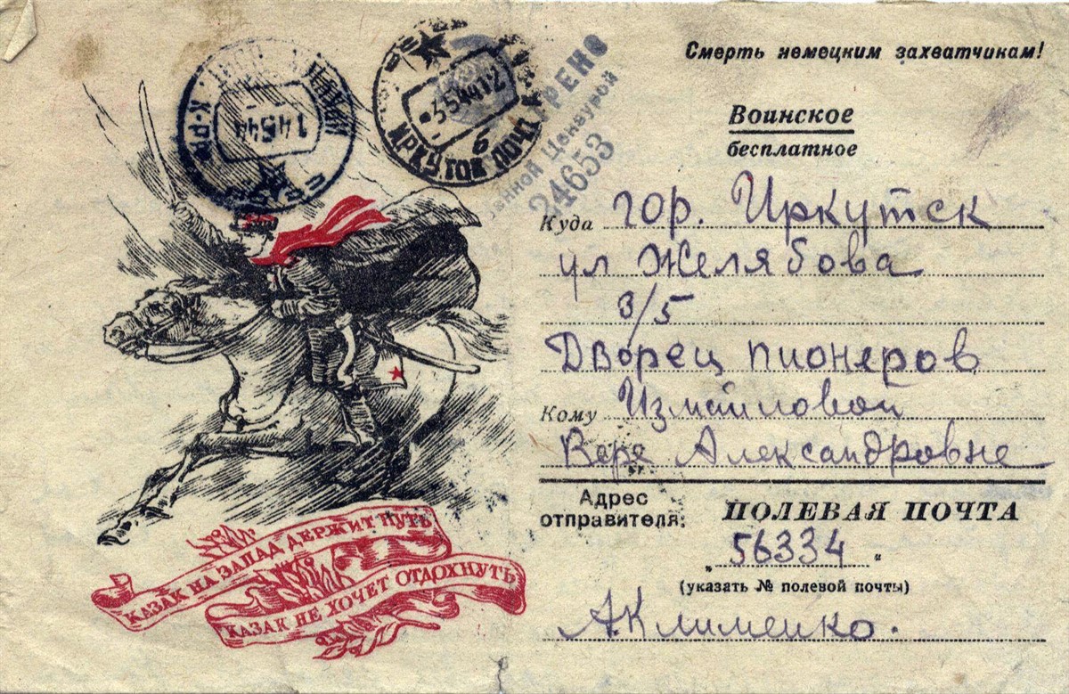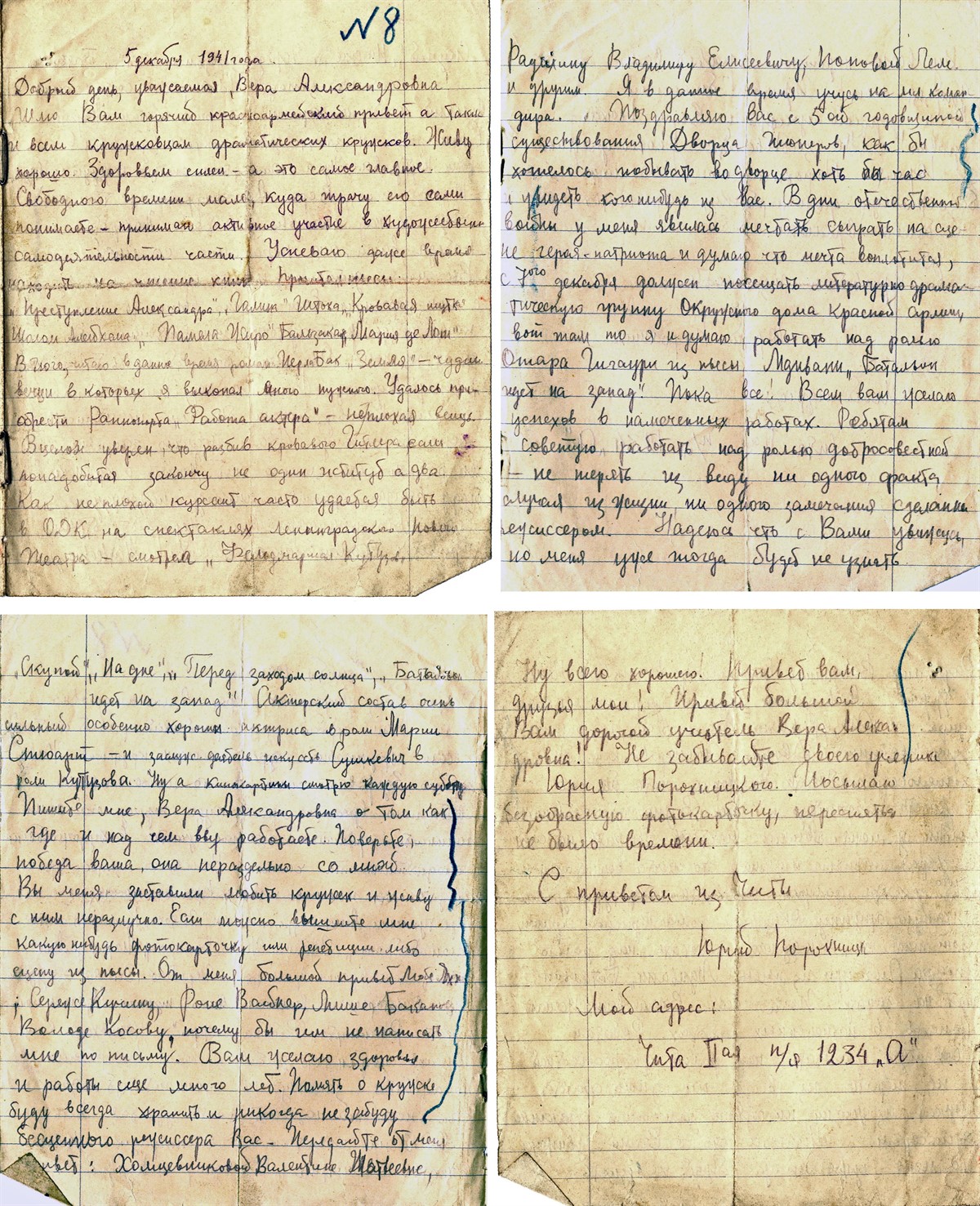 И, конечно, с фронта на адрес Дворца пионеров шли письма — документы огромной силы! В пропахших порохом строках дыхание войны, грубость суровых окопных будней, нежность солдатского сердца, вера в Победу… Это своеобразная художественная летопись времен военного лихолетья, обращение к героическому прошлому наших предков, призыв к беспощадной борьбе с захватчиками.