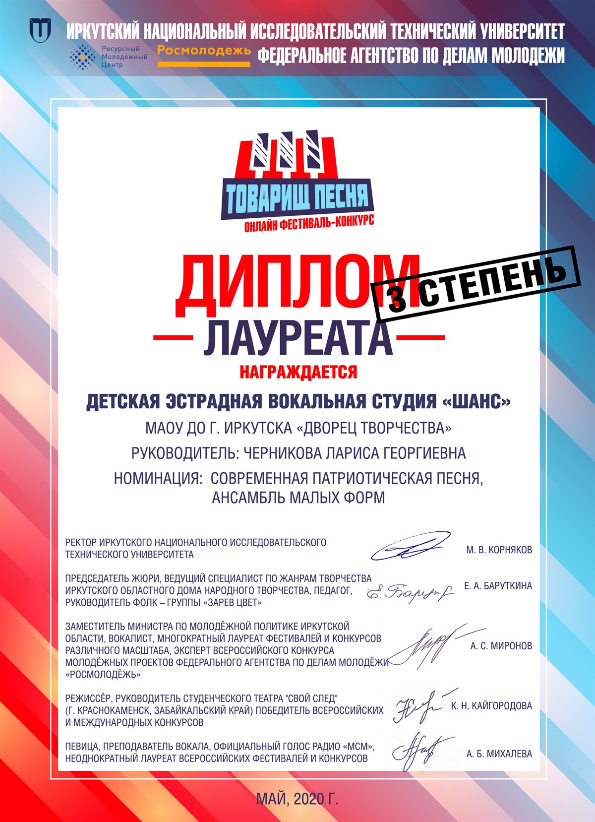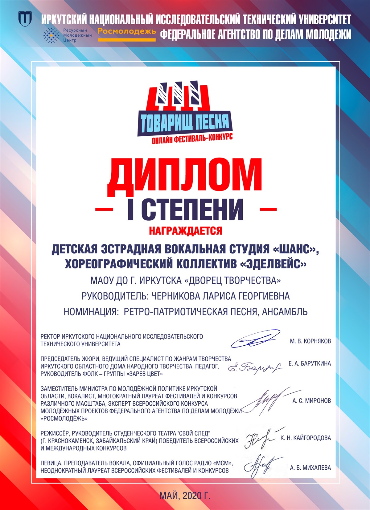 Завершился Второй Всероссийский онлайн фестиваль-конкурс военной и патриотической песни «Товарищ песня», в котором приняли участие коллективы Дворца творчества: детская эстрадная студия "Шанс" и студия современного танца "Эдельвейс", постановка – педагога-организатора Рогашковой С.Л.