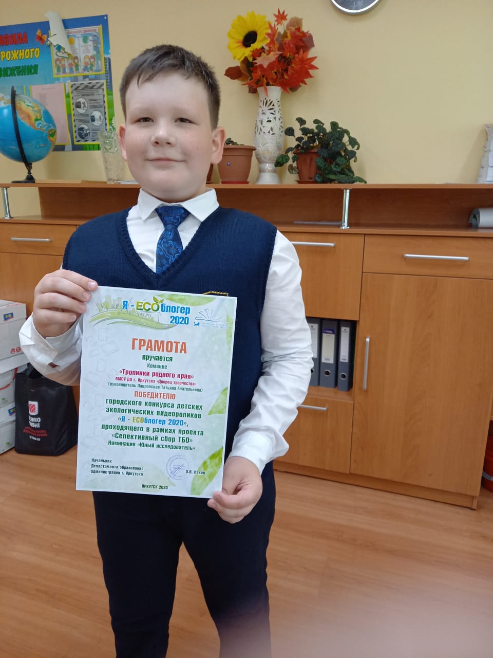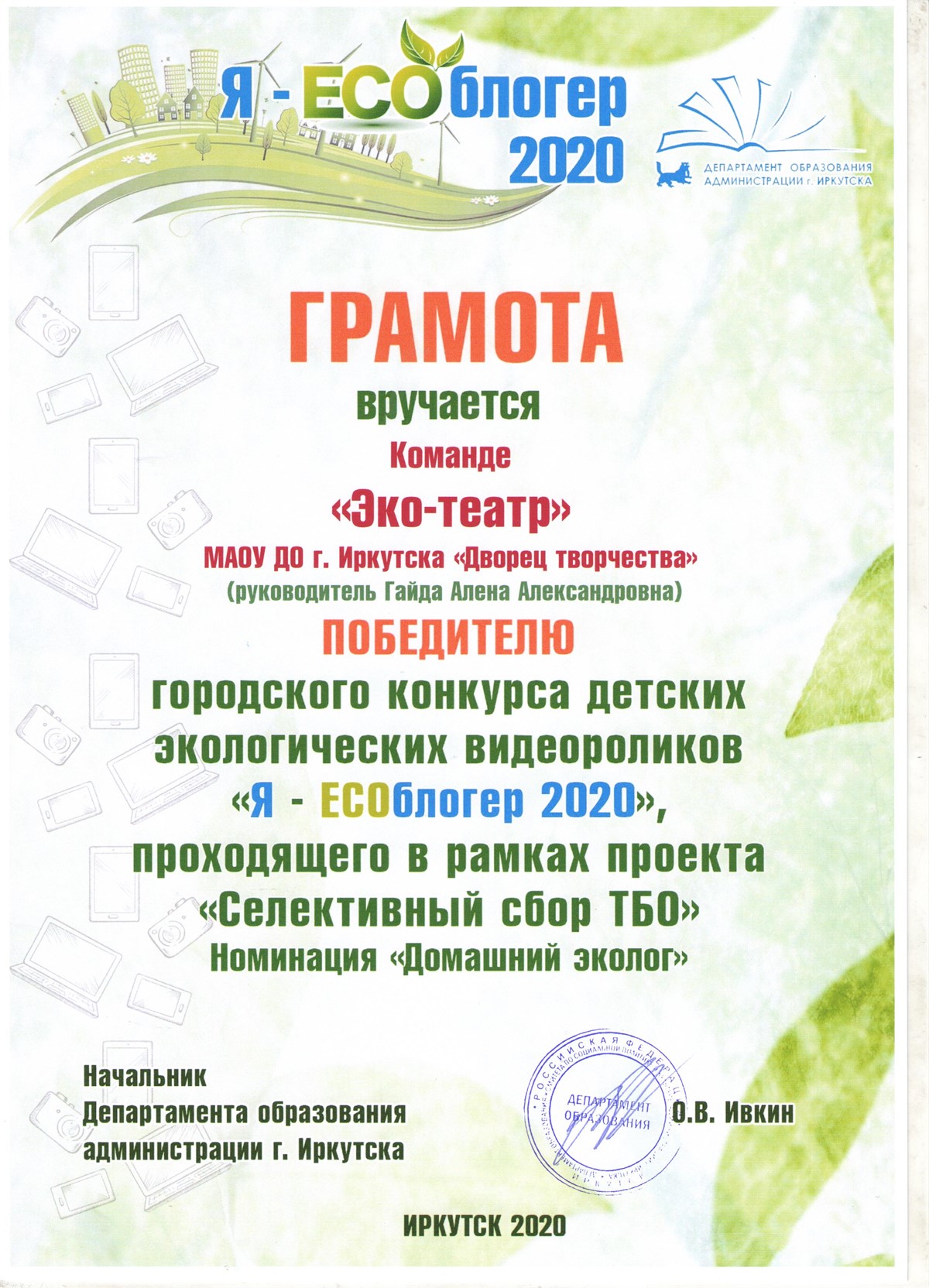 В номинации «Домашний эколог» победители: МАОУ ДО г. Иркутска "Дворец творчества" студия телевидения «СОК» с роликом «Спирогира на Байкале», экологическая команда «Эко.театр» и творческое объединение «Тропинки родного края», а также МБОУ СОШ № 64 «Социальный ролик», МБОУ СОШ № 4 «Секреты эко.семьи», и МБОУ СОШ № 65 «Видеорассказ об экологических привычках членов семьи в домашнем быту, направленных на уменьшение загрязнения окружающей природной среды».