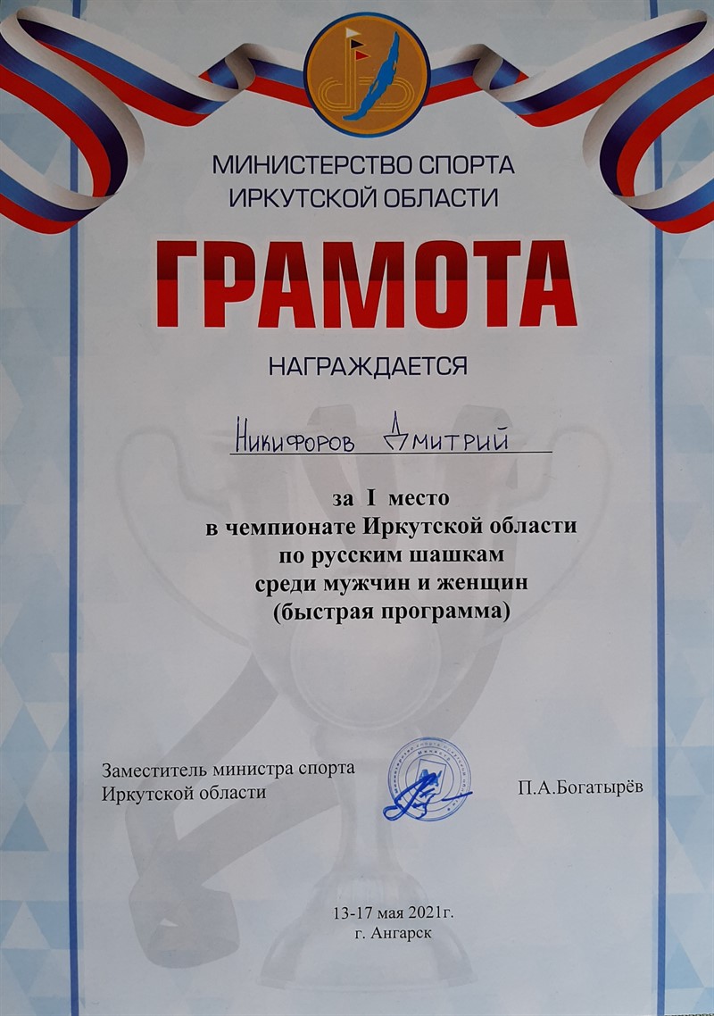 С 14 по 16 мая 2021 года в Ангарском городском округе прошёл чемпионат Иркутской области по русским шашкам. Соревнования проходили по трём программам (классическая, быстрая и молниеносная).