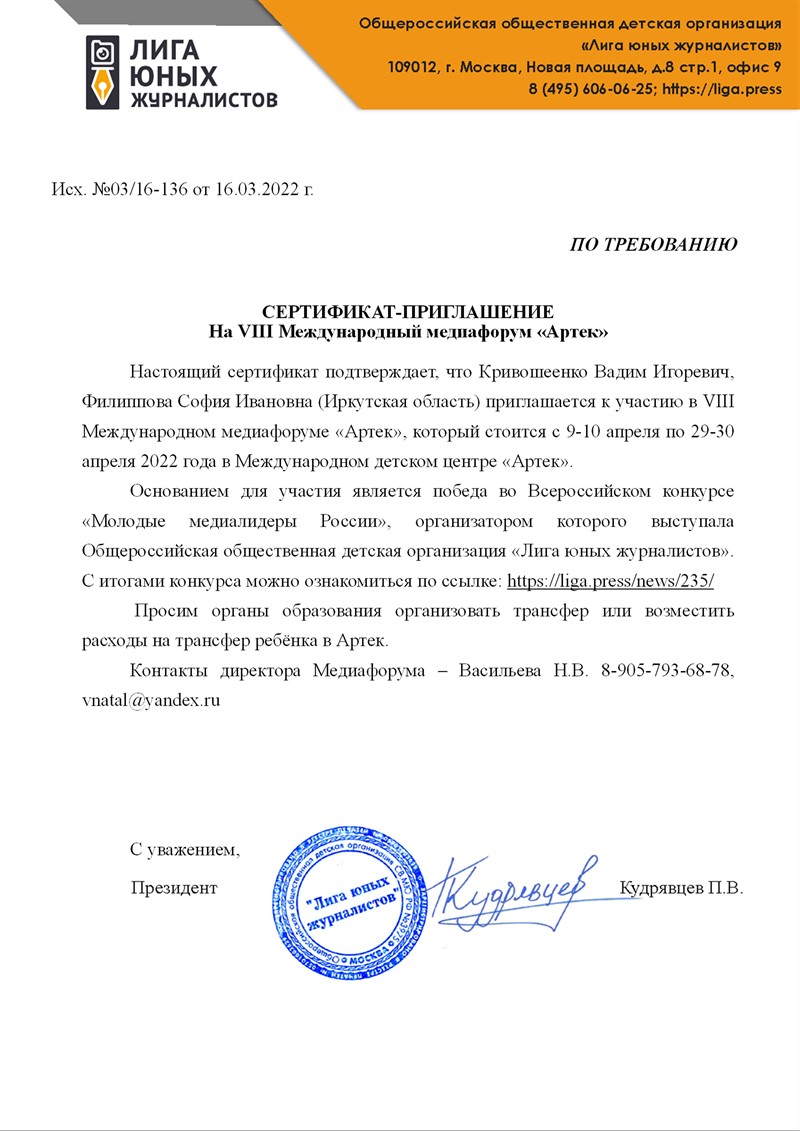 От медиастудии «Сок» на конкурс было подано две работы: документальный фильм «Они были первыми» (авторы София Филиппова и Вадим Кривошеенко) и сюжет «Как рождается герой. Павел Скороходов» (авторы Лада Мельникова, Богдан Федоров). София и Вадим получили Гран-при и приглашение на VIII Международный медиафорум «Артек», который пройдёт в МДЦ «Артек» с 9 по 29 апреля. Диплом 1 степени получили Богдан и Лада, они находятся в резервном списке участников медиафорума.
