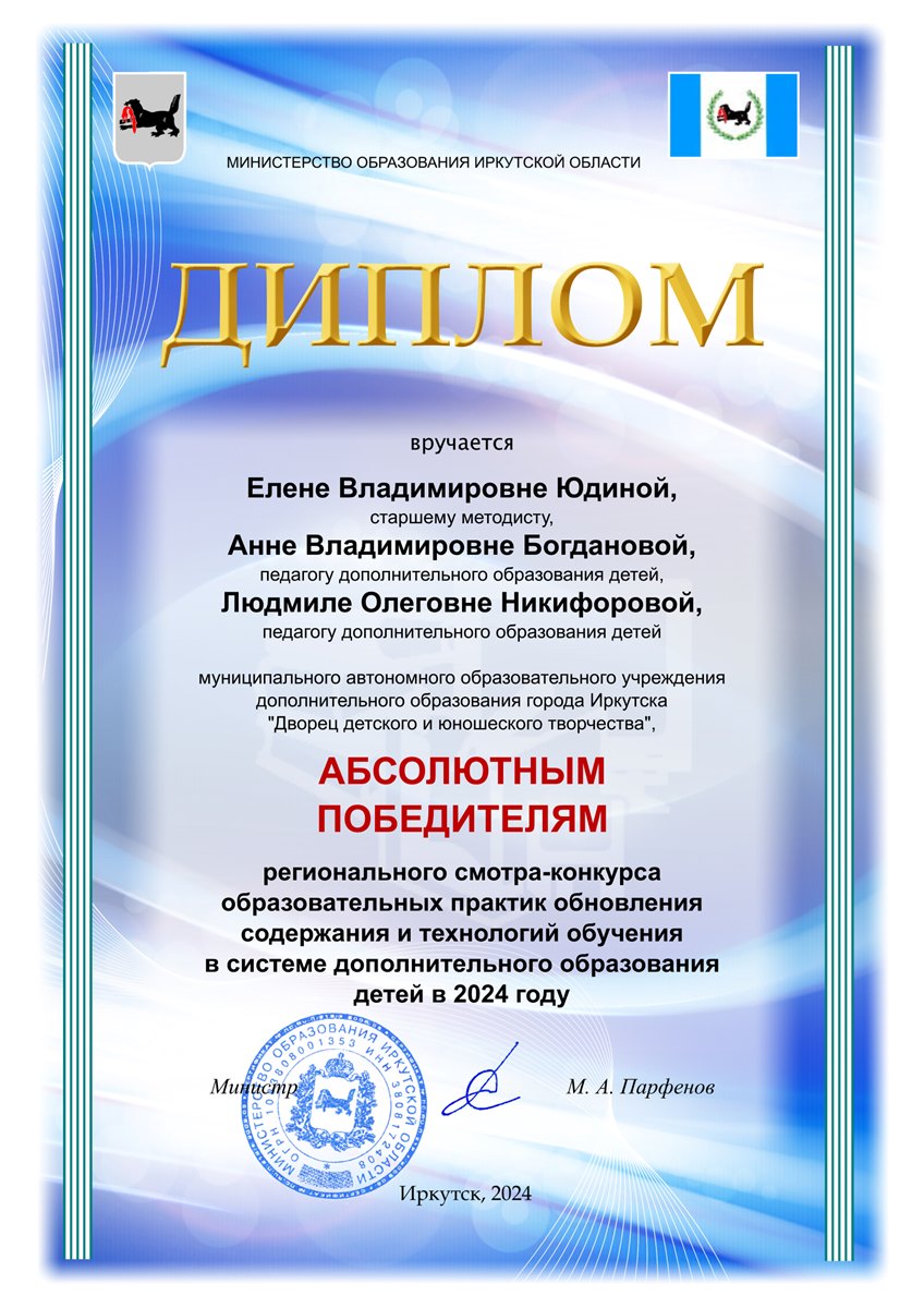 Поздравляем Юдину Елену Владимировну, Никифорову Людмилу Олегову и Богданову Анну Владимировну с ПОБЕДОЙ в Региональном смотре-конкурсе образовательных практик обновления содержания технологий обучения в системе дополнительного образования детей!!!