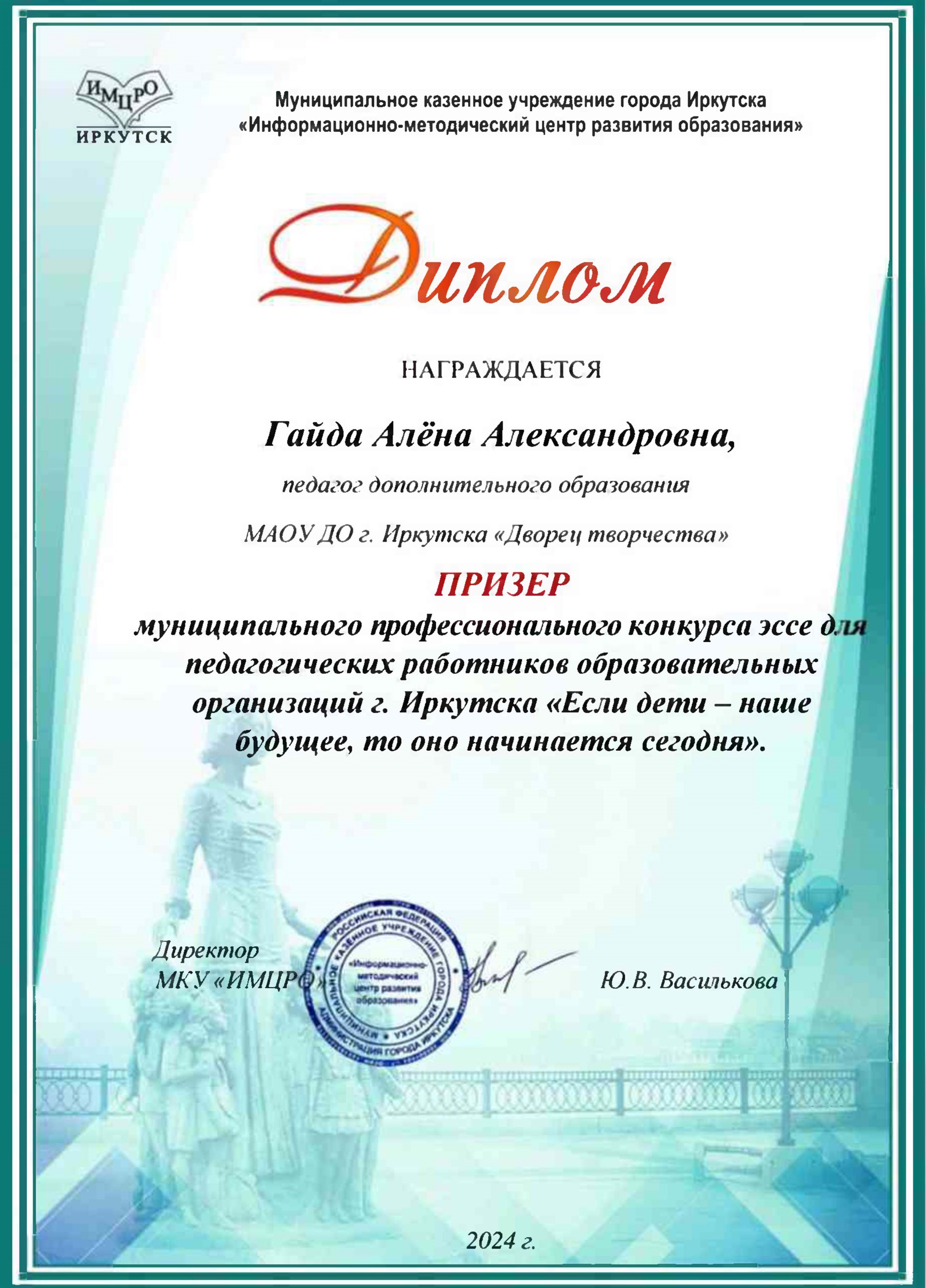 Поздравляем Гайда Алёну Александровну, педагога дополнительного образования, призера муниципального профессионального конкурса эссе для педагогических работников образовательных организаций города Иркутска «Если дети – наше будущее, то оно начинается сегодня».