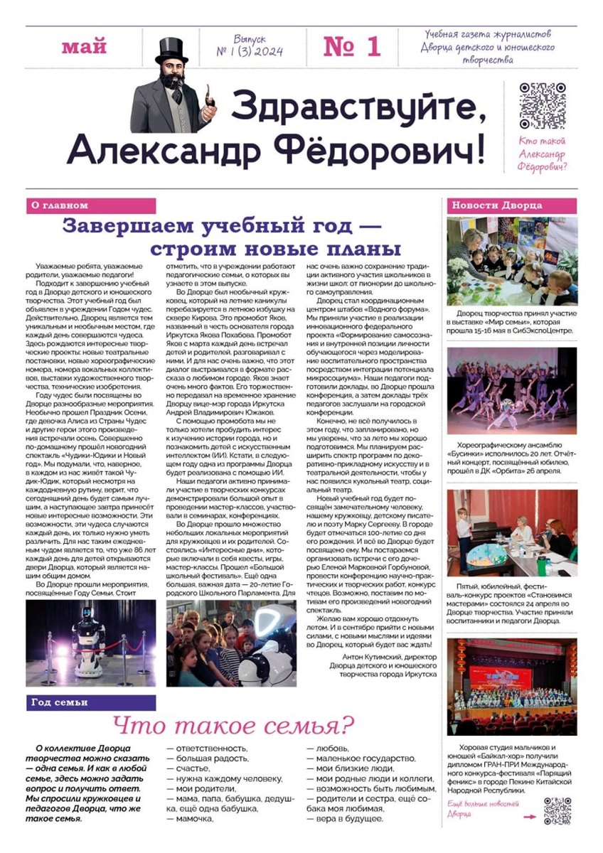Учебная газета журналистов Дворца творчества «Здравствуйте, Александр Фёдорович!» издаётся в МАОУ ДО г. Иркутска «Дворец детского и юношеского творчества» (Адрес: 664011, г. Иркутск, ул. Желябова, 5.) с осени 2023 года. Целью газеты является информирование родителей и обучающихся о последних новостях Дворца творчества.