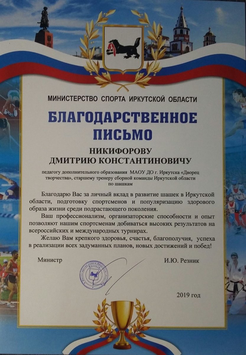 Никифоров Дмитрий Константинович, тренер-преподаватель по шашкам высшей категории, старший тренер сборной команды Иркутской области по шашкам. Гроссмейстер России, Академик Академии шахматного и шашечного искусства, победитель Кубка Мира, педагог дополнительного образования высшей квалификационной категории. ДОП "Шашки" Ссылка на деятельность педагога /page/5616